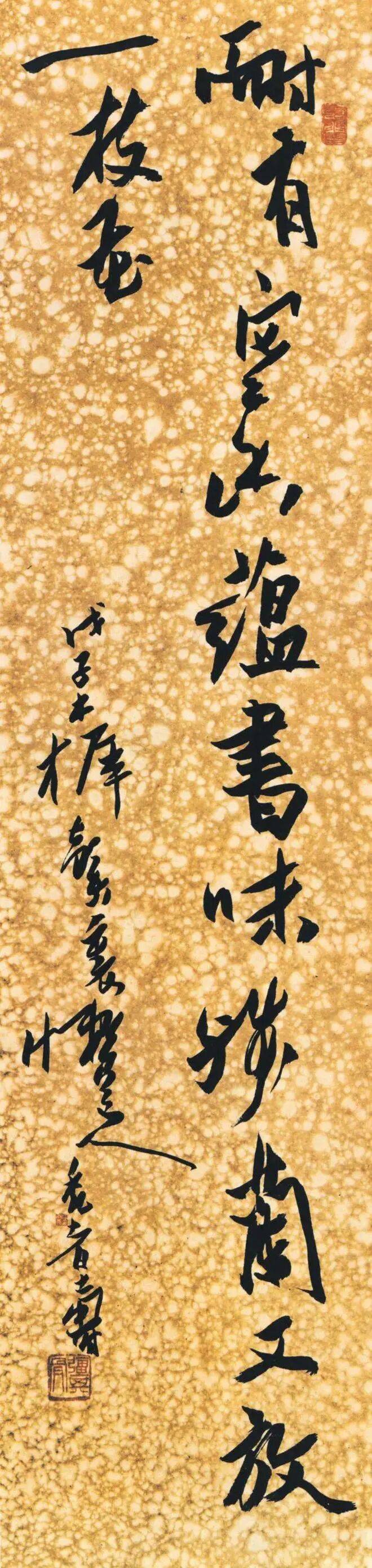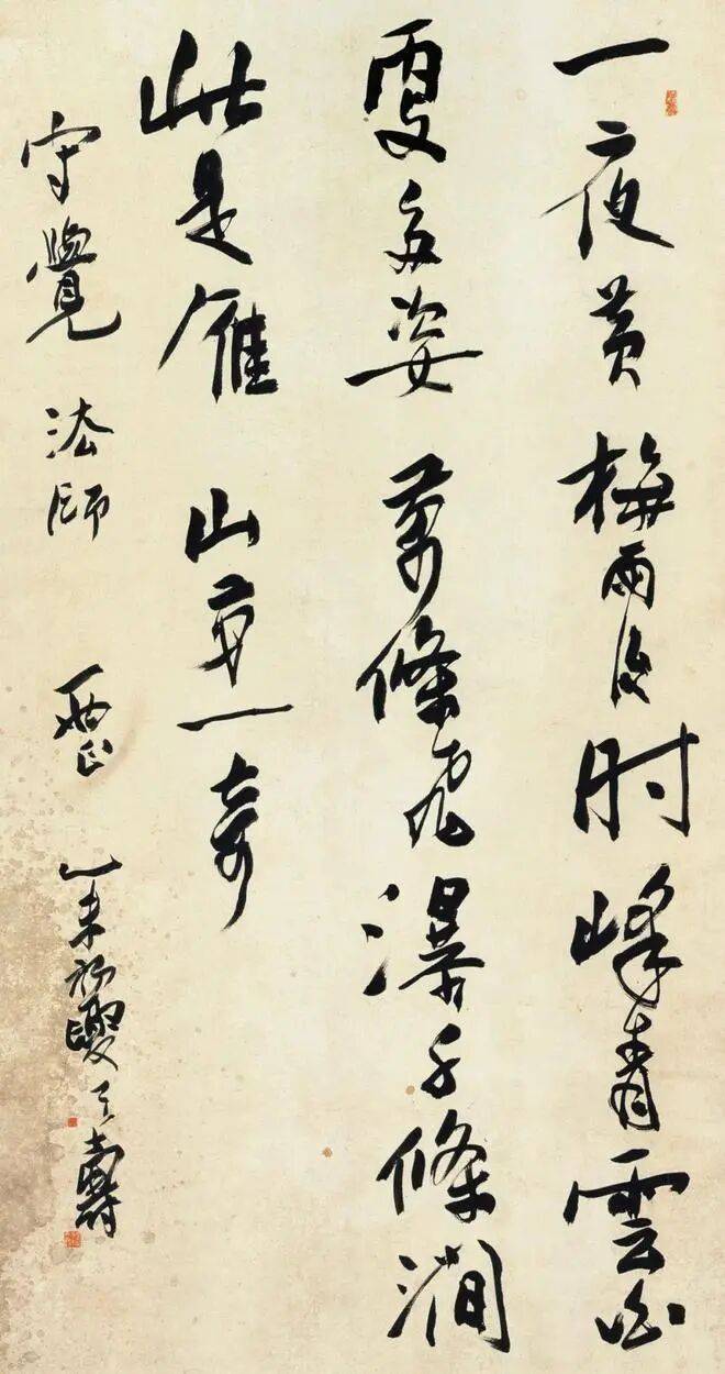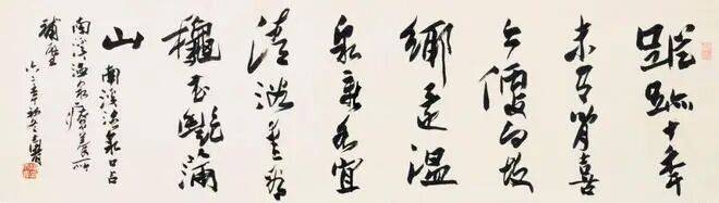 在成熟期书风中, 最富于特色、最引人注目的当属行草。与其篆隶书以圆笔筑基不同, 诉诸行草书的多为侧锋方切和侧带中、中带侧的用笔, 除了少数笔画被夸张拉长, 或辅以牵丝连带外, 点画皆短促斩截, 随着起笔转锋动作顺势而过, 或收锋或出锋, 或折锋转入下笔, 而极少藏头逆锋和圆转形态。这种瘦劲、生辣、峻峭并略带荒率的线条形质, 作为潘天寿书法艺术的构成元素之一, 在另一个尤为作者重视和强化利用的构成元素—空间特征的并协处理之下, 愈加显得与众不同。