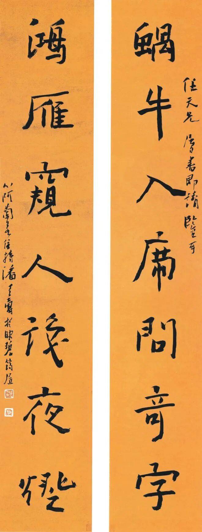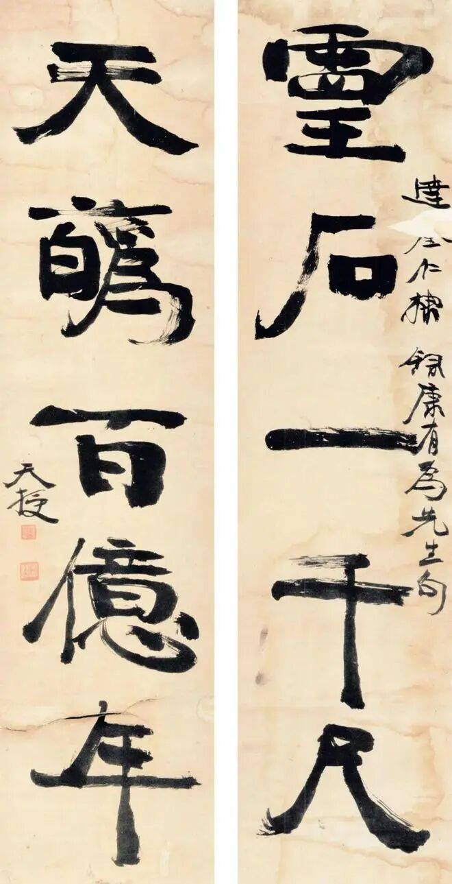 由于抗战时毁于兵火和十年浩劫中毁于动乱, 现存的潘天寿书法作品, 已难以串连起一条细致的发展脉络, 但以二十世纪三十年代中期为界, 仍可看到两个不同的阶段。前一阶段书体较多, 取法较广, 面貌辗转变化, 而又有多凭天性书写的成分贯穿其间。后一阶段以融会黄道周一路书风为特征, 书体渐趋稳定, 法度日见精严, 鲜明而强烈的个人面貌得以确立。