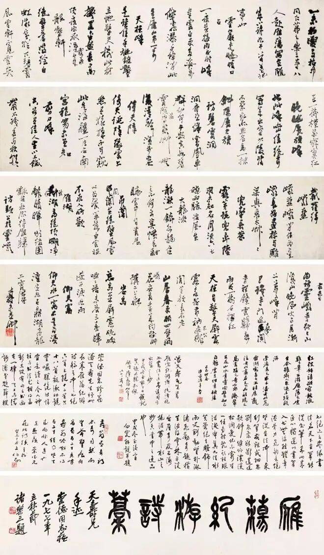 无论谋篇、行气、单字结构, 还是单字内部的空间分割;无论章法行列之间被刻意强调并充分调度的聚散、避让、倾轧、生克, 还是结字造型的大小错落、斜正穿插、疏密映衬以及移位、反常、重心欹侧多变, 乃至由字与行、点线与空白的图地互动关系所建构的收放对比、动静对比、虚实对比, 无不贯穿着造险、破险、以险制夷、反欹为正的主导动机。那种平直的线条、匀称的结构部件、娴静整齐的字形和行列, 是与之绝缘的。在某些作品中, 不仅通过减缩、夸张、错置、割裂单字结构的方式, 以服务于章法上的开合起落效果, 而且打破行行相列、正文与署款主从分明的传统习惯, 使正文的一部分写成独行大字, 另一部分骤然变小而与署款相混同。