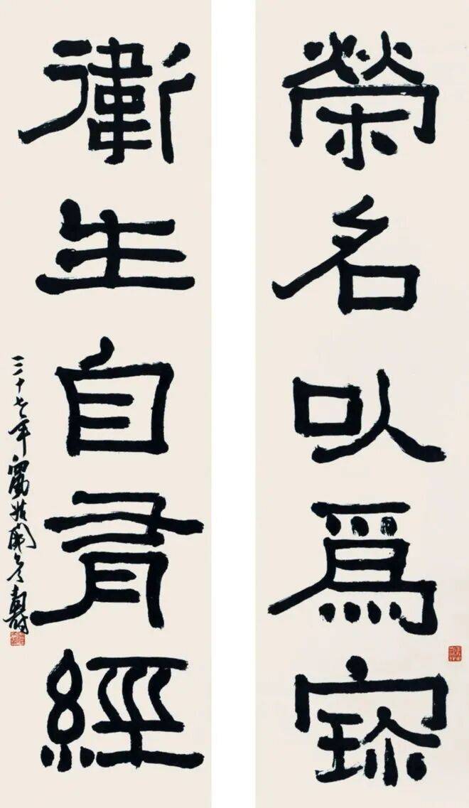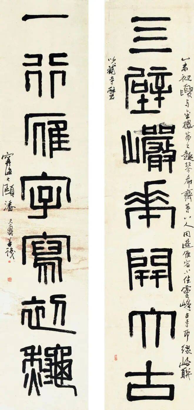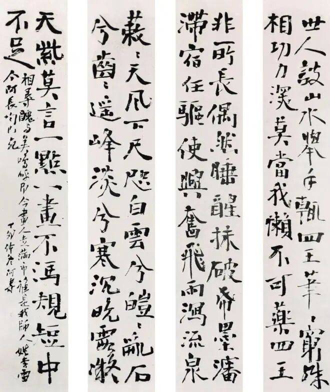 在某种意义上还不妨说, 潘天寿书法比起许多尊出处、重家数的传统型书法来, 要更注重书法的专业化特征及其精神表现功能, 更自觉更执著地将自己的艺术追求维系在历史主义基线上。他深入到书法构成元素的内部, 努力发扬它们所具有的潜力, 但始终保持着文字结构的完整性和合理性。