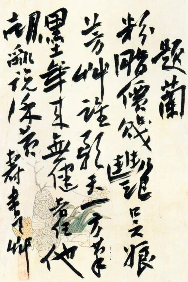 粗粗排列一下与此相关的历代名家, 如苏轼、米芾、赵佶、赵孟頫、文徵明、陈淳、倪元璐、八大山人、金农、郑燮、赵之谦、吴昌硕、齐白石等等, 可以清楚地看到, 越是往后, 画家充实书坛变革力量的倾向就越明显, 从而改变了以往书家善画或者书与画分而治之的状态。潘天寿的书法艺术, 尤其是表现在书写技巧、空间构成方式、审美观念和精神内涵之中的与众不同的个性特色, 恰可与其绘画互为诠释。大开大合的构图, 重骨尚气、强力健势的造型, 经常占据画面中心部位的方形巨石, 奇崛多姿的长线条与棱角分明的折笔……诸如此类基于相应美学取向的操作习惯、运思方式和价值体认, 既在形而下的层面上通贯于书法艺术的形态学成果, 也在形而上的层面上为书法艺术建构了观念变革的契机。