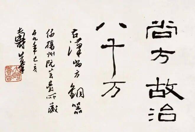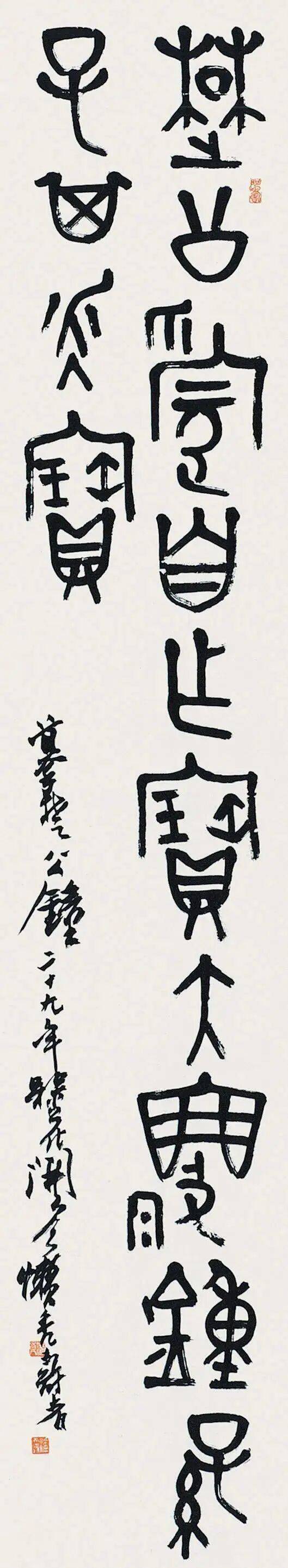 当然, 过分强调绘画的横向作用, 是有悖潘天寿书法本来面目的。像二十世纪八九十年代某些现代派书法那样的绘画化创作理念, 或者任意调侃、解构书法的革新方式, 与潘天寿书法毫无共同之处。而像齐白石、徐生翁、钱瘦铁、吕凤子那样多为师心自用的画家书法, 或者像黄宾虹、吴湖帆、来楚生那样偏重传统书法趣味的画家书法, 也与潘天寿书法各存距离。