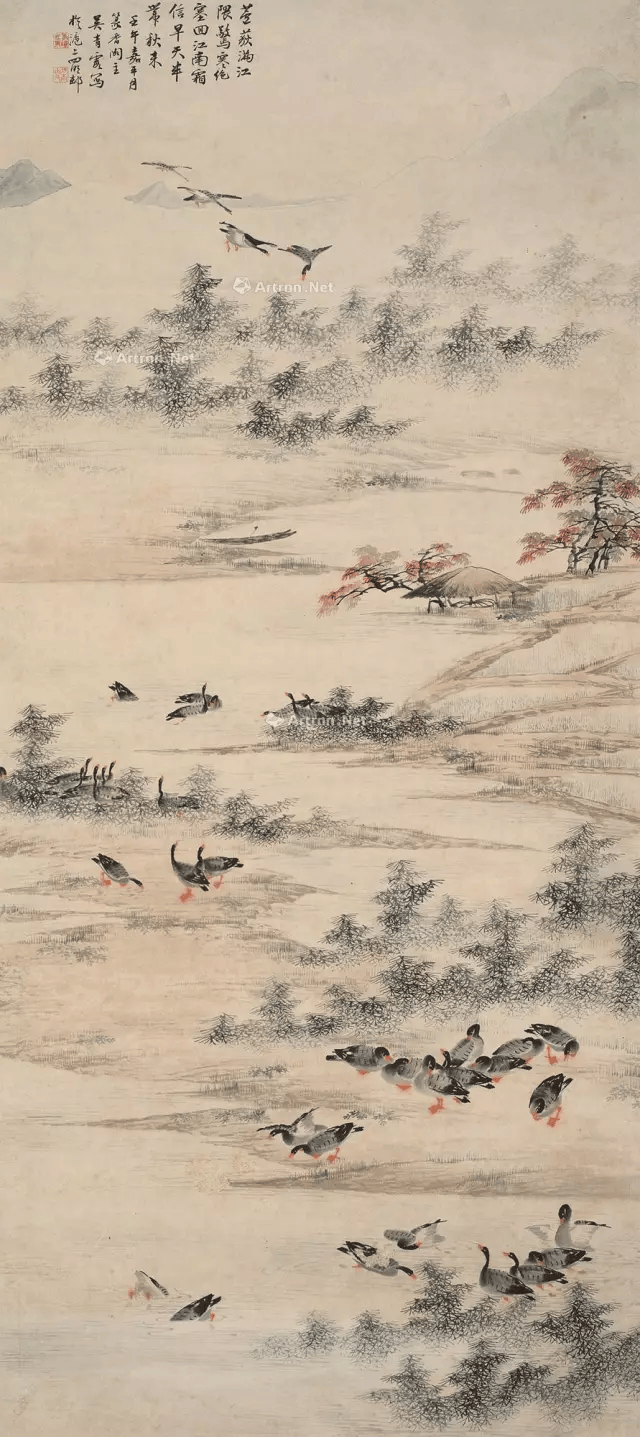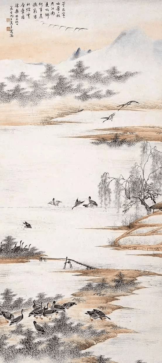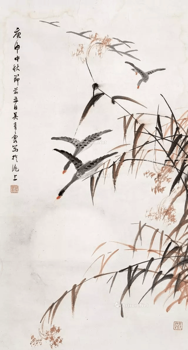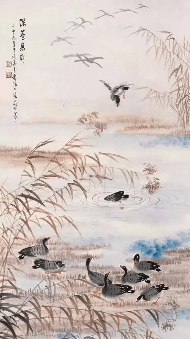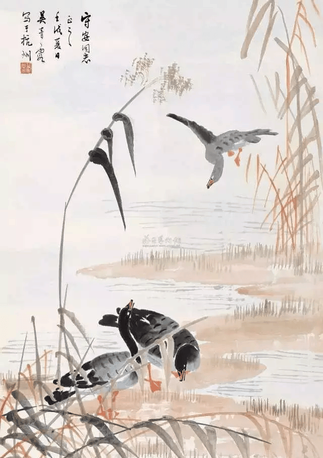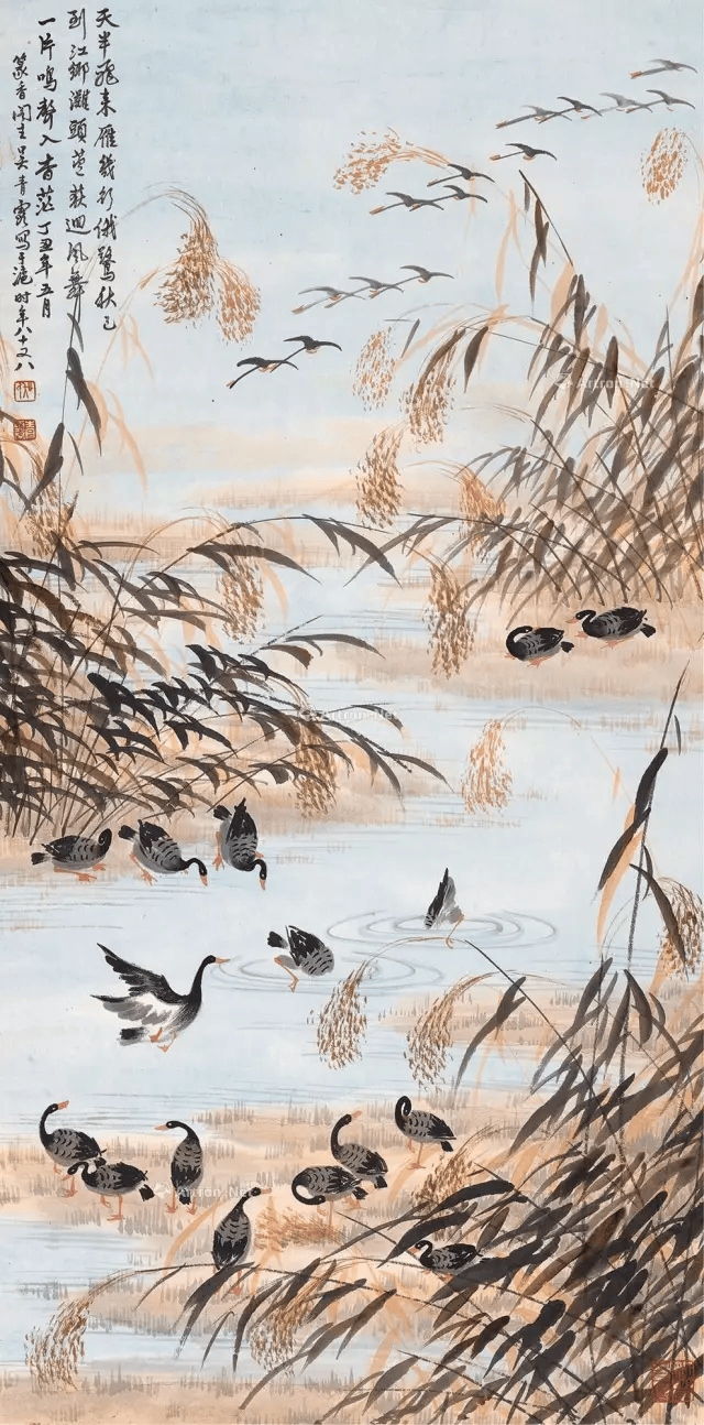吴青霞自幼喜欢画芦雁。在父亲的指导下,认真临摹宋人芦雁范本和参悟画法。后来,尤喜清代边寿民画法,作品渐成一宗。但作为女性画家,她画的芦雁,情趣细腻;芦苇线条即见挺拔刚劲,又有风中摇曳婀娜多姿之势。芦雁纷落平沙,千姿百态,真可谓“气韵生动”。