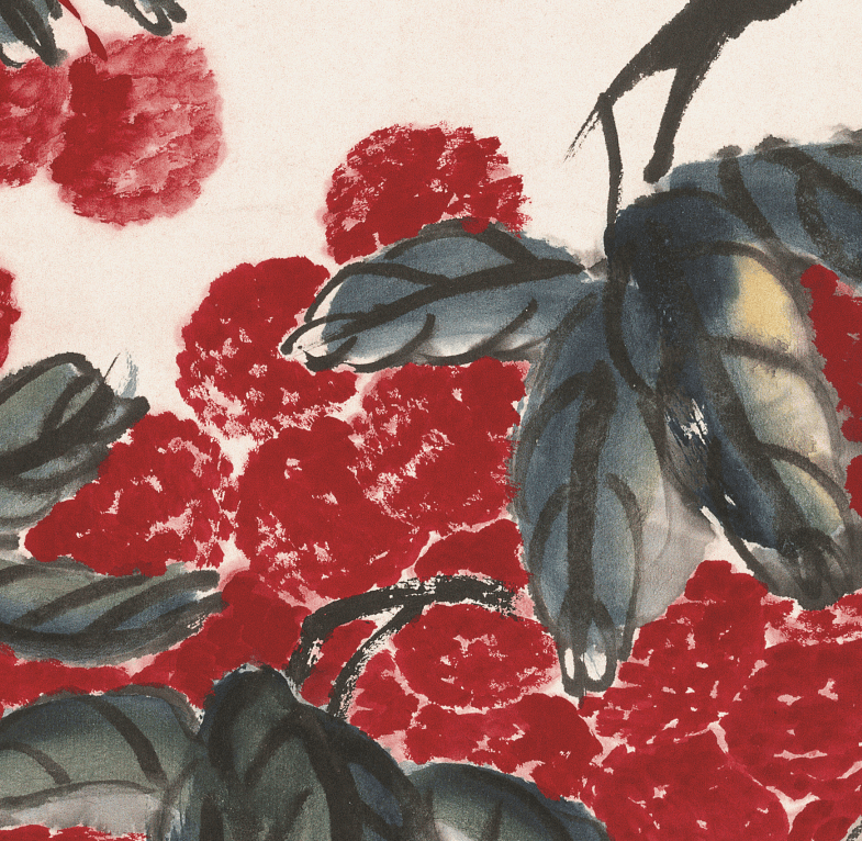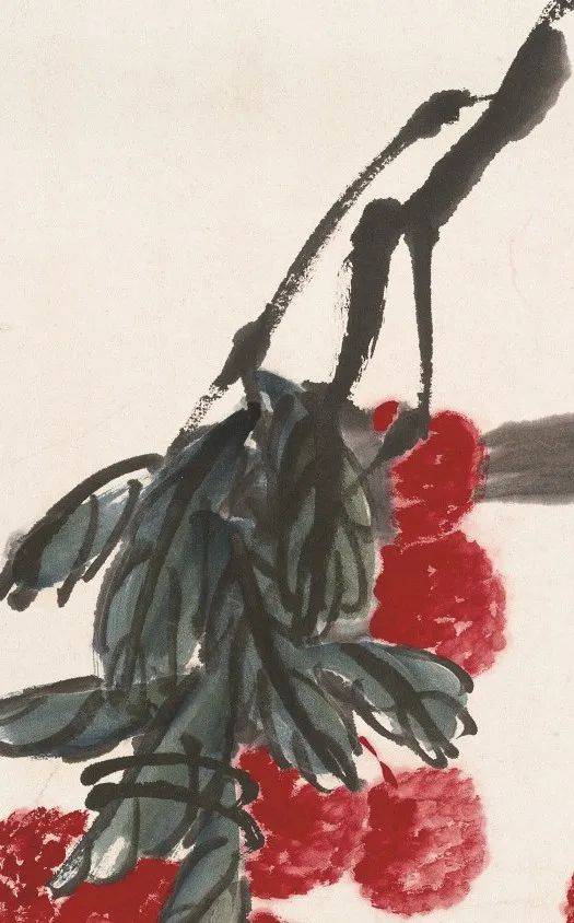 《大利图》绘一筐红艳的荔枝,取“荔”音为“利”,寓意大吉大利。齐白石以荔枝为题材的作品中常见两种类型,一为满树满枝令人垂涎的果实,另一种则如本次展出这件作品般将荔枝放于竹筐、竹篮中,显得更为富足丰实。