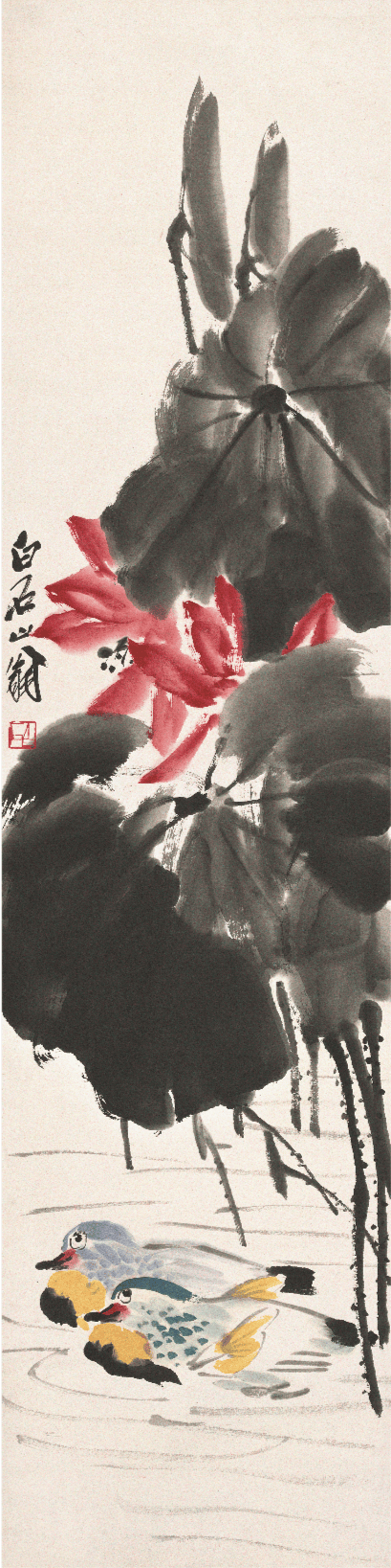 《红荷鸳鸯》 齐白石 133×33cm 北京画院藏