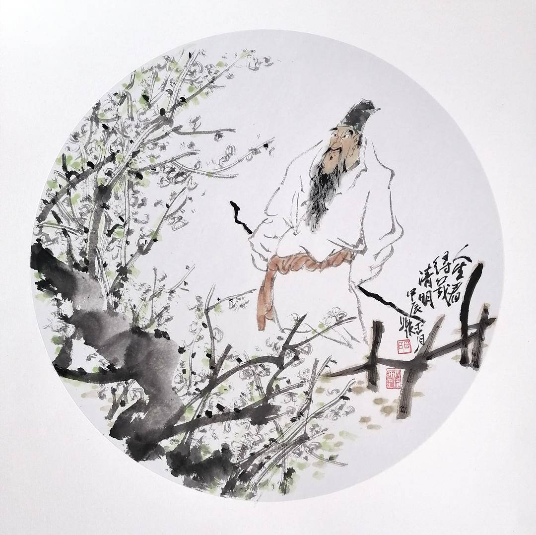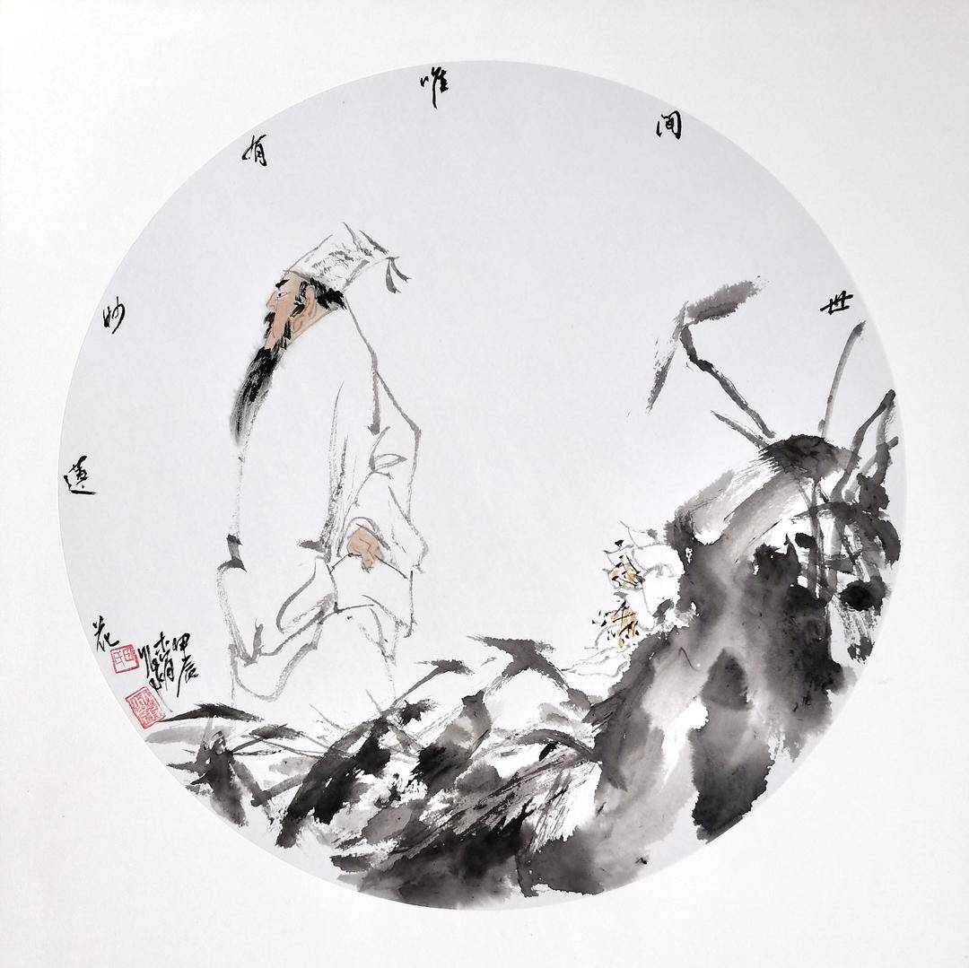 田兆水先生拥有坚实绘画功底和丰厚传统学养,自然深谙此道。多年来创作颇丰,出版有《田兆水画集.梁山一百单八将》、《田兆水画集.先秦诸子百家》。他的人物画创作题材丰富,或以古代先贤、或以文学形象,或以诗词意象。其秉承一贯的“去繁就简”的“减笔画”之法,以篆籀笔意入画,中、侧锋并用,使转纵横,点画狼藉,墨色浓淡相宜,线条枯润相生,设色自然典雅,人物造型不求工细,落笔冷消,简洁明快,形象生动,妙趣横生。画风古雅奇拙,笔致疏落,笔意苍秀,超然出尘,气清而神腴,墨淡而趣足,可谓笔境兼得。他主张艺术创作勿泥古不化,要借古开今,以达到从古人入、从造化出的艺术境界。