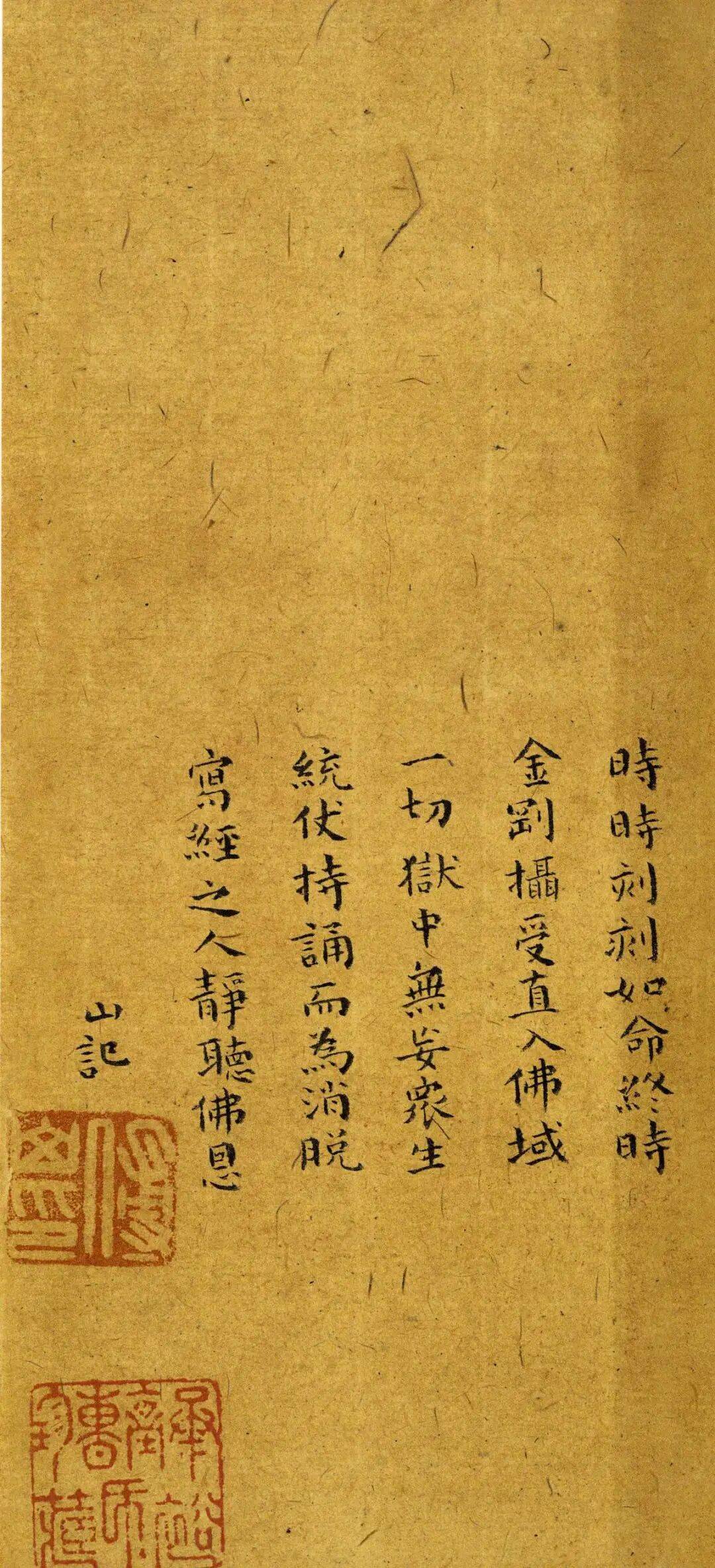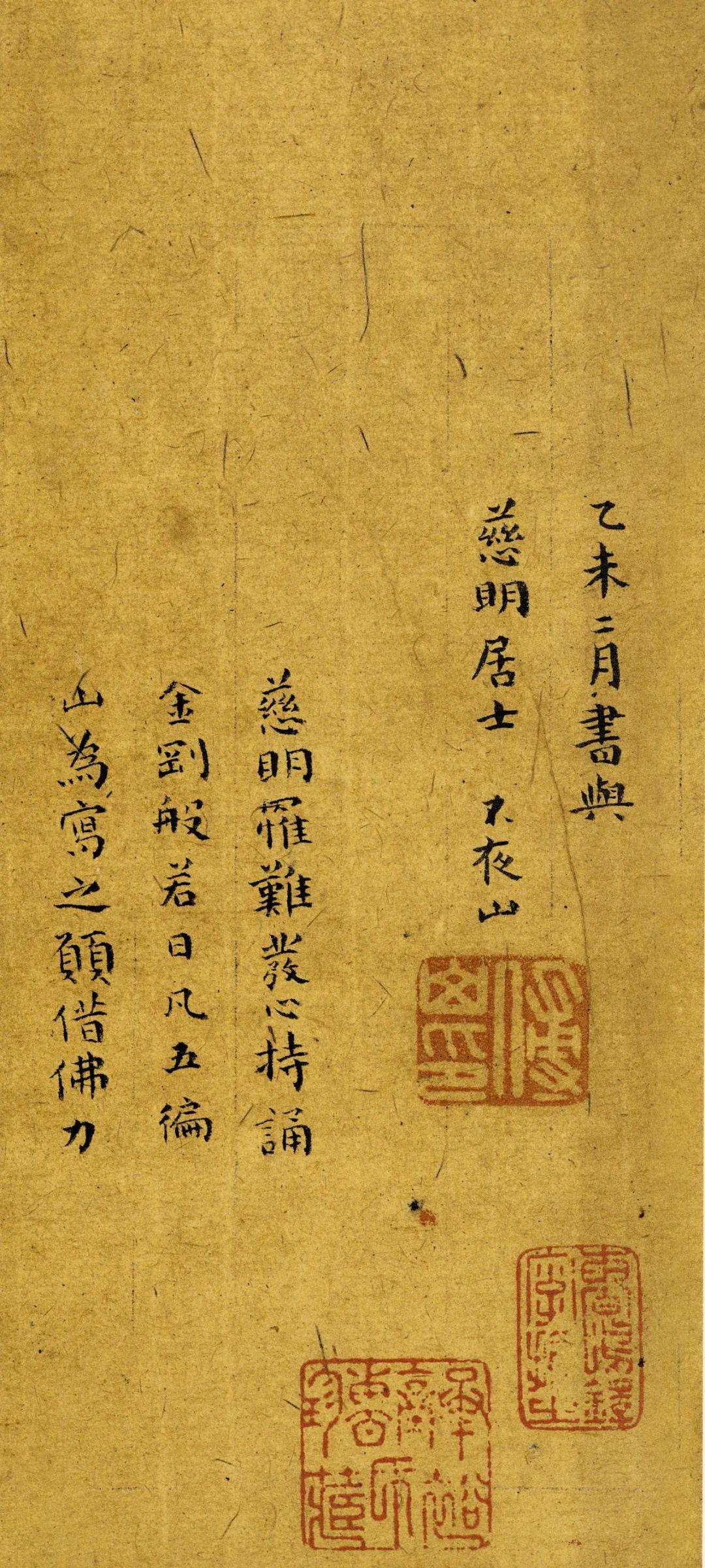 这册《金刚经》后书有“乙末”二字,乙末年为清顺治十二年(1655)。傅山在顺治十一年(1654)六月因受宋谦谋反案所牵连,在太原被捕入狱,即所谓的“朱衣道人案”。傅山在狱中遭受酷刑,曾绝食9日,后被门人和一些清政府官员全力相救,于顺治十二年七月出狱。
