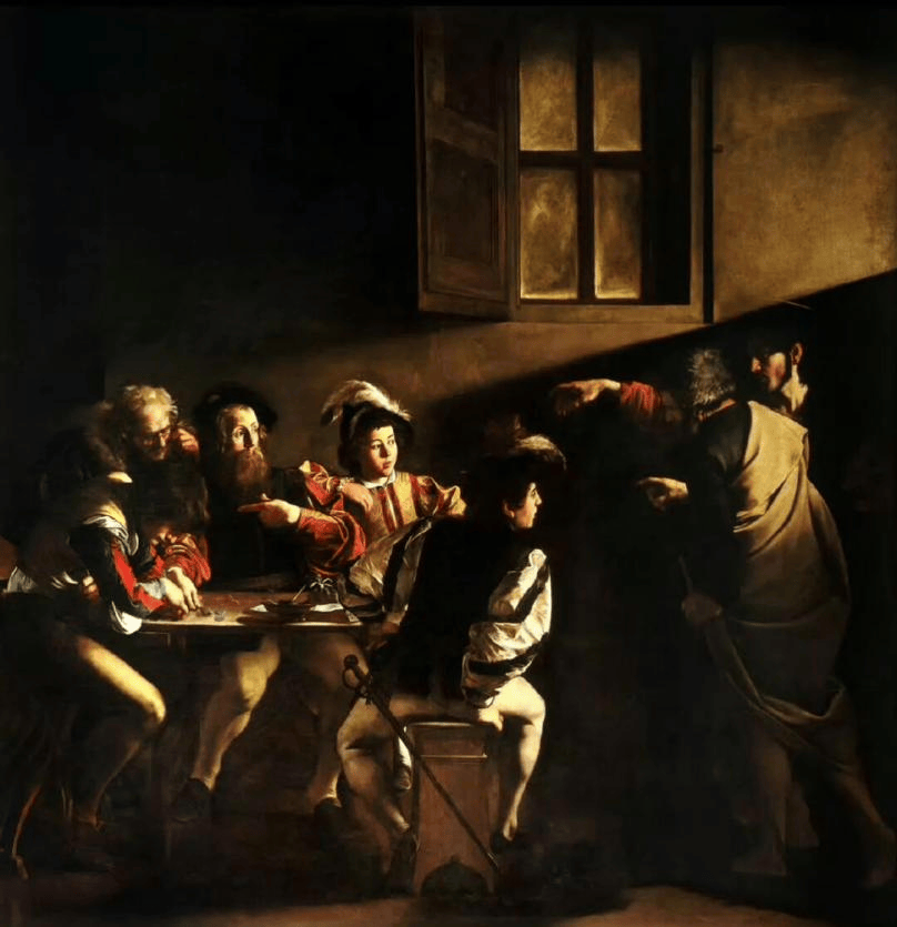 当然,只要欣赏艺术,都会经历“流”和“转”。西方绘画对应的是外流转。比如,卡拉瓦乔有幅很有名的画叫《圣马太蒙召》。有很多宗教故事背景。而对圣经故事不太了解的人,也能感到这幅画的美。画面是在一个简单的房间里——是否知道这是酒窖,不重要。上面有一扇窗,外面一道光照进来,照在主角圣马太身上。随着他惊讶的表情,这道光拐到边上的人物——耶稣也用手指向他。