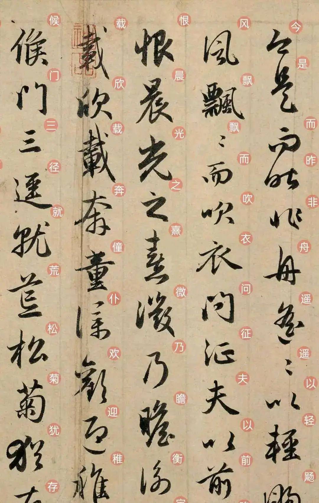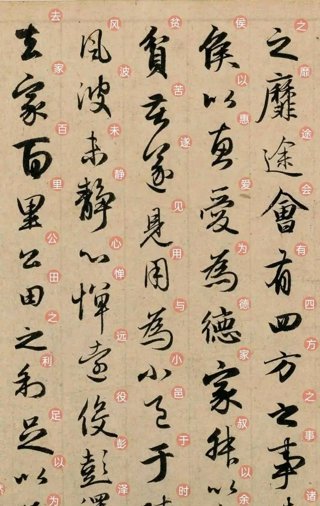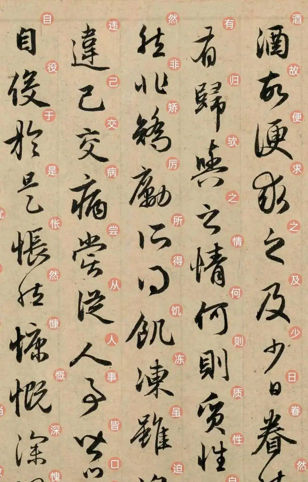 看“鸟倦飞而知还”的“鸟”字,起笔像鸟喙轻点在纸面,行笔间笔锋有微妙的颤动,似翅膀展开时空气的振感;最后收笔的小勾,就像尾羽划过天空。旁边的“倦”字,也跟着添了一丝疲惫的味道。