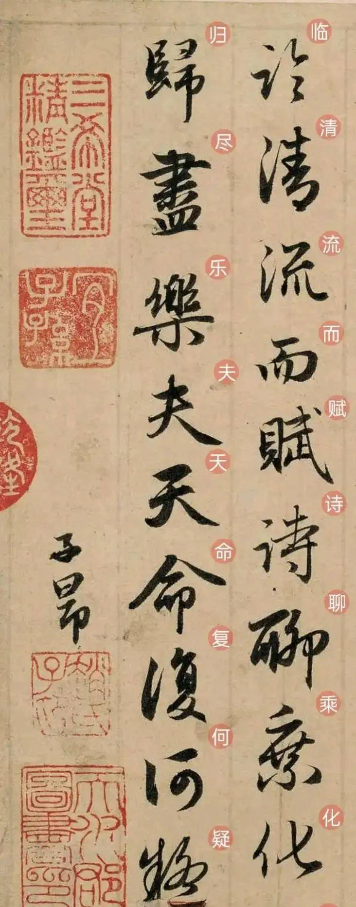 再看“木欣欣以向荣”的“木”,竖画挺得像树干,横画舒展似枝条,撇画尖尖的,像新叶冒出来。既不是刻意讨好眼睛的漂亮,而是笔墨里透出陶渊明“见南山”的惊喜,又带着赵孟頫“写爽了”的通透畅快。