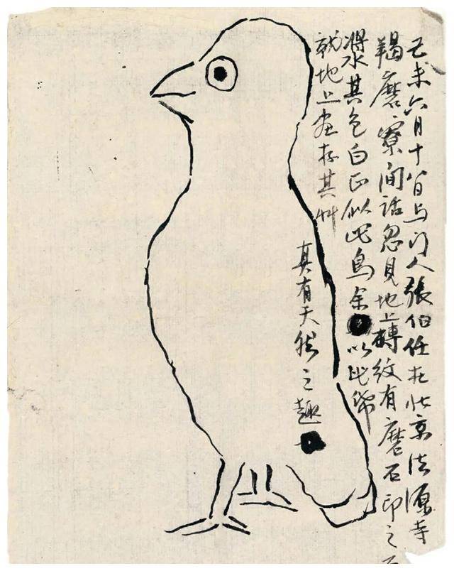 1919年7月的一天,齐白石正坐在法源寺的羯磨寮间与徒弟张伯任谈话。忽然,他的目光落在破旧的地砖上,发现一个类似小鸟的图案格外特别。出于兴趣,他随手取来一张纸,便将这个图案画了下来。 这幅看似简单的画作,乍一看并不引人注目。齐白石所画的鸟,线条粗犷,眼神呆滞,毫无美感。但让人意外的是,这幅怪画竟然成为齐白石一生的珍藏,他一直携带着它,近40年之久。