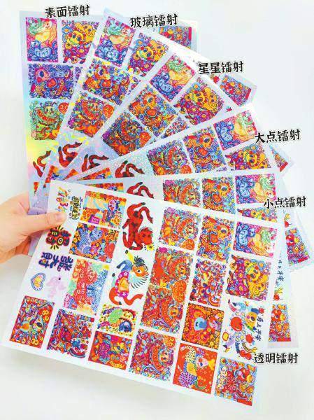 素面镭射、玻璃镭射、星星镭射、大点镭射……当记者第一眼看到孙博秀芳推出的马年年画文创贴纸产品的时候,最引人注目的就是其表面的彩虹反光效果。