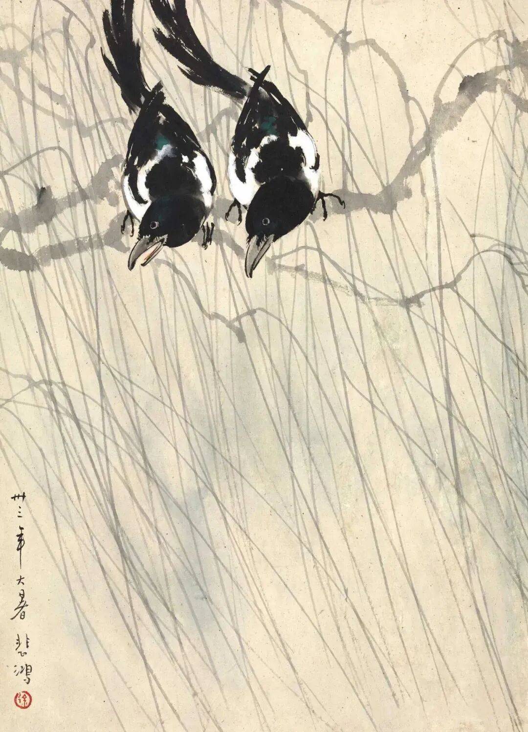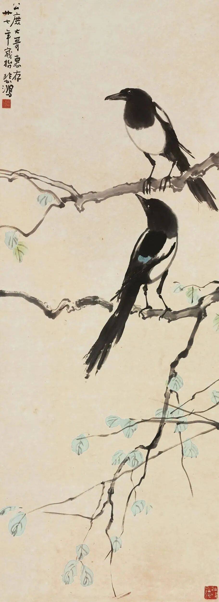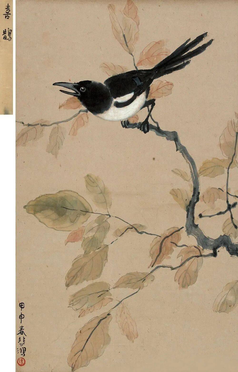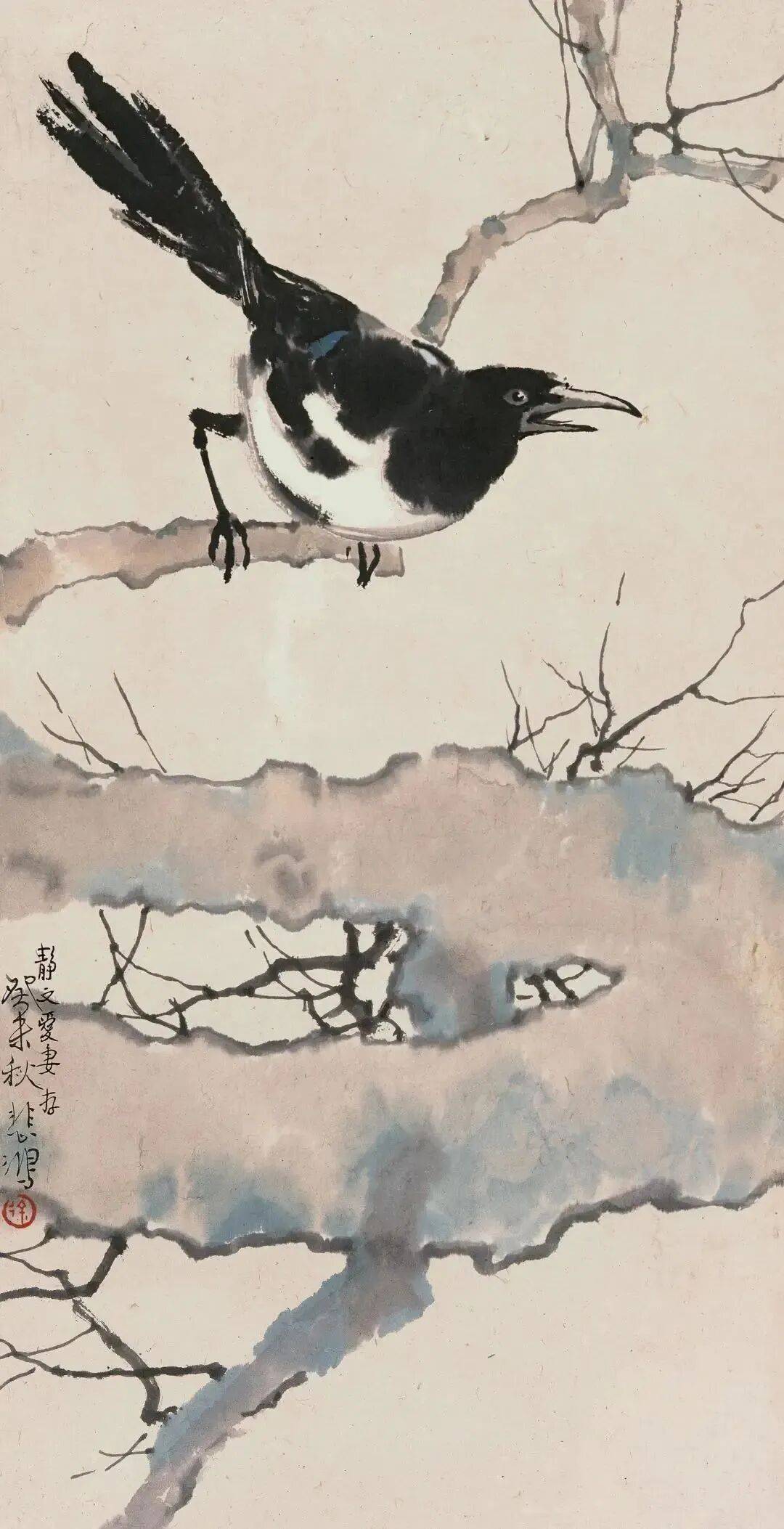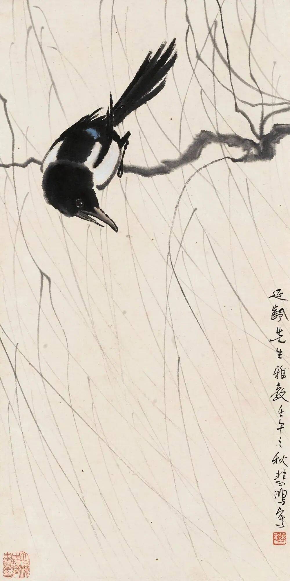 徐悲鸿笔下的喜鹊,是中国近现代花鸟画中融合中西技法的典范之作。他以西方写实精神重塑传统吉祥题材,在保留“喜上眉梢”文化寓意的同时,赋予喜鹊生动的形体结构与鲜活的生命气息,形成了形神兼备、笔墨与科学并重的独特风格。