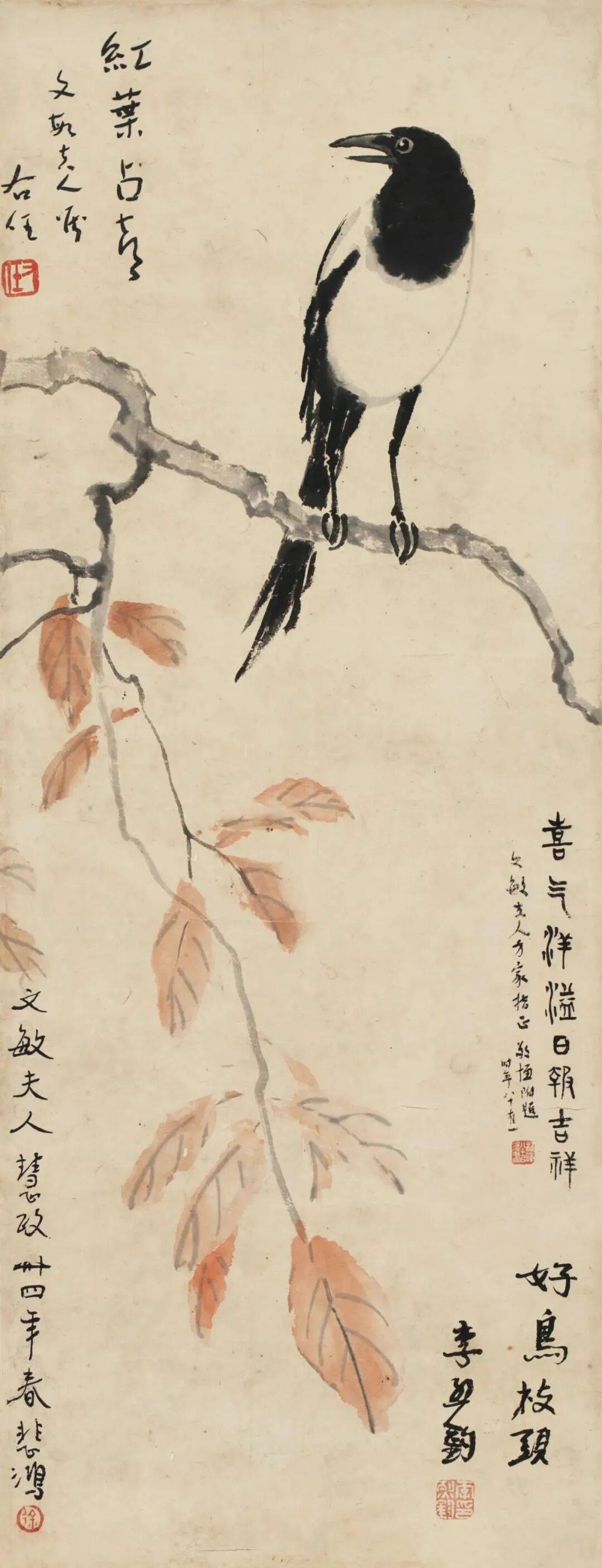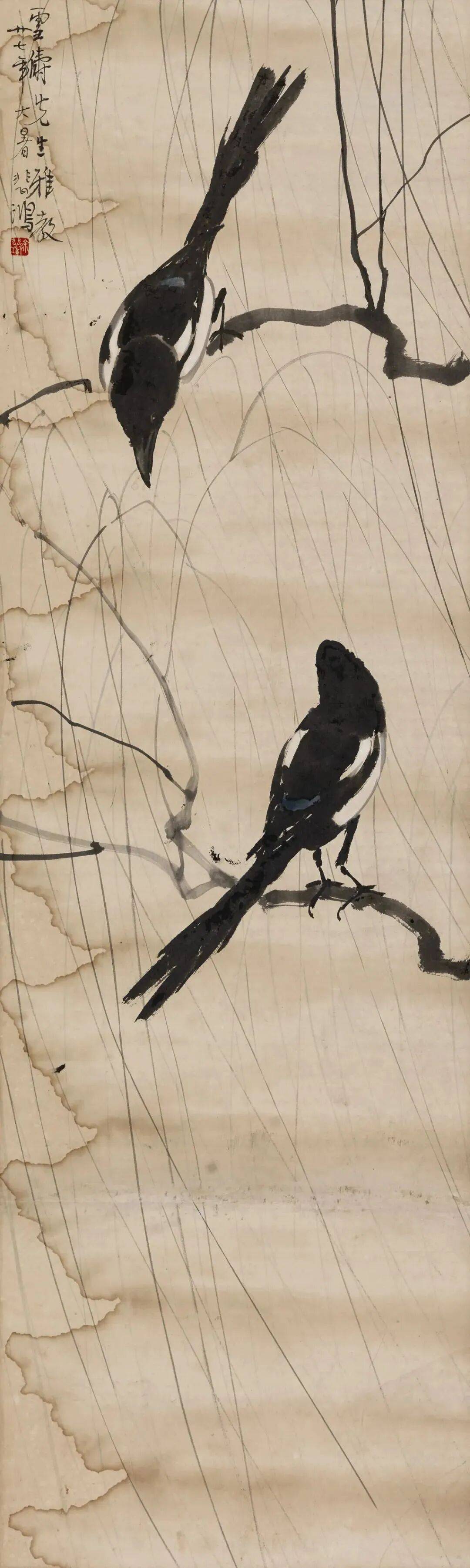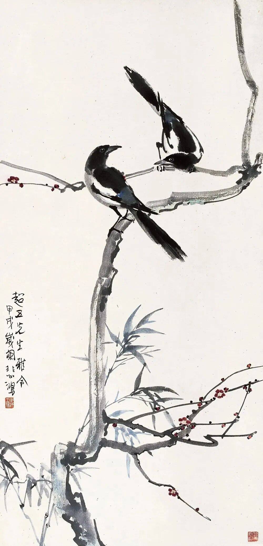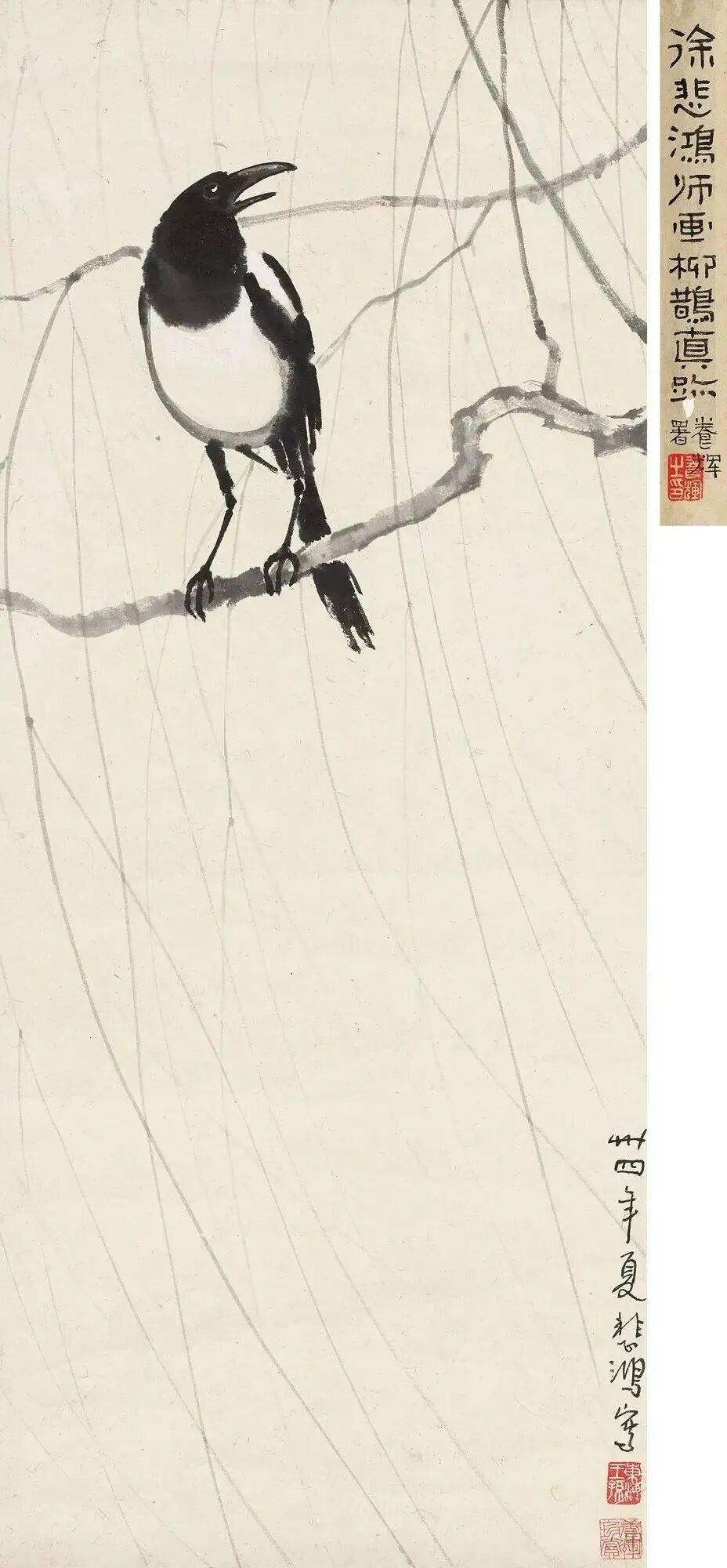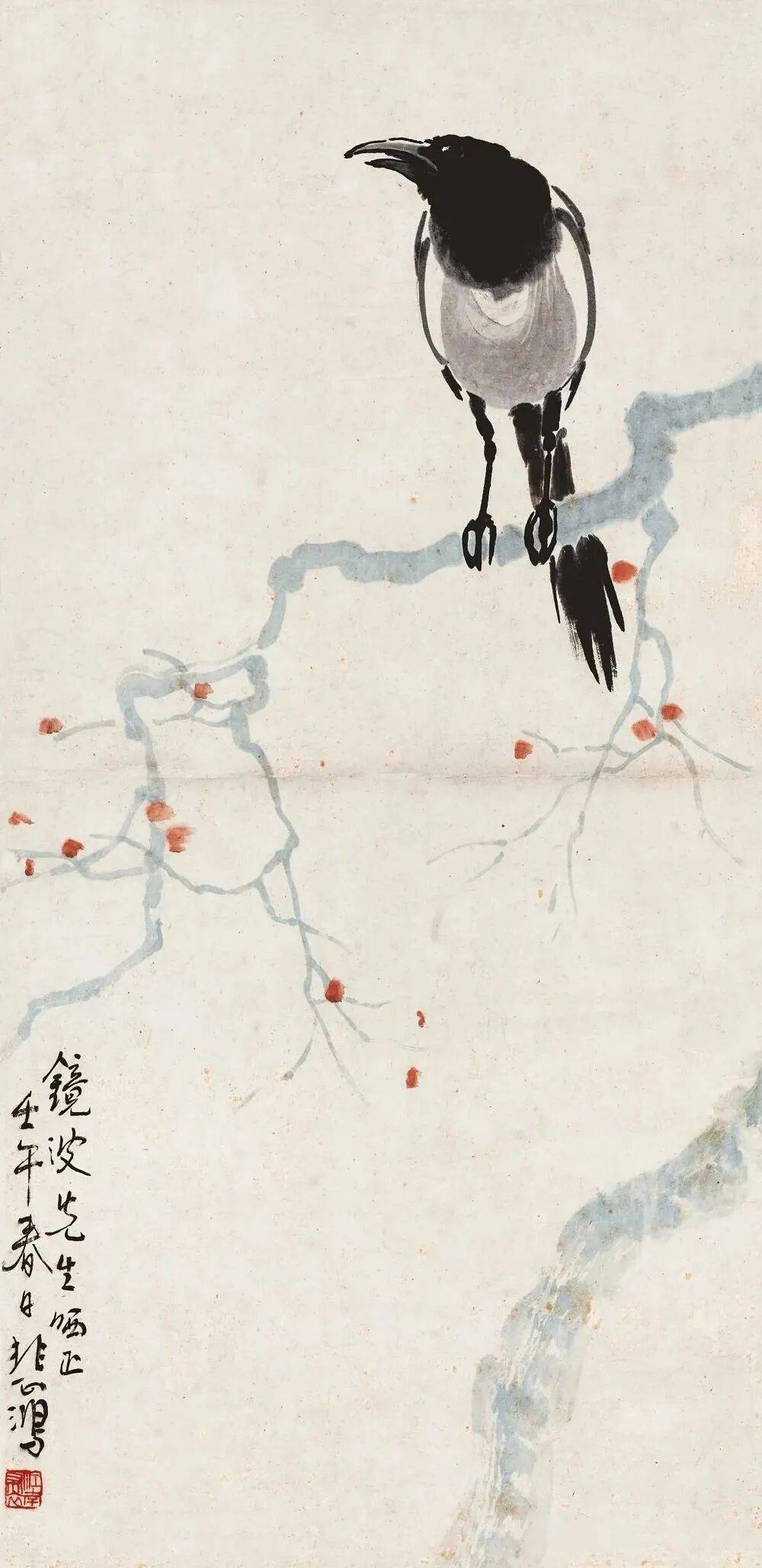 徐悲鸿笔下的喜鹊,是中国近现代花鸟画中融合中西技法的典范之作。他以西方写实精神重塑传统吉祥题材,在保留“喜上眉梢”文化寓意的同时,赋予喜鹊生动的形体结构与鲜活的生命气息,形成了形神兼备、笔墨与科学并重的独特风格。