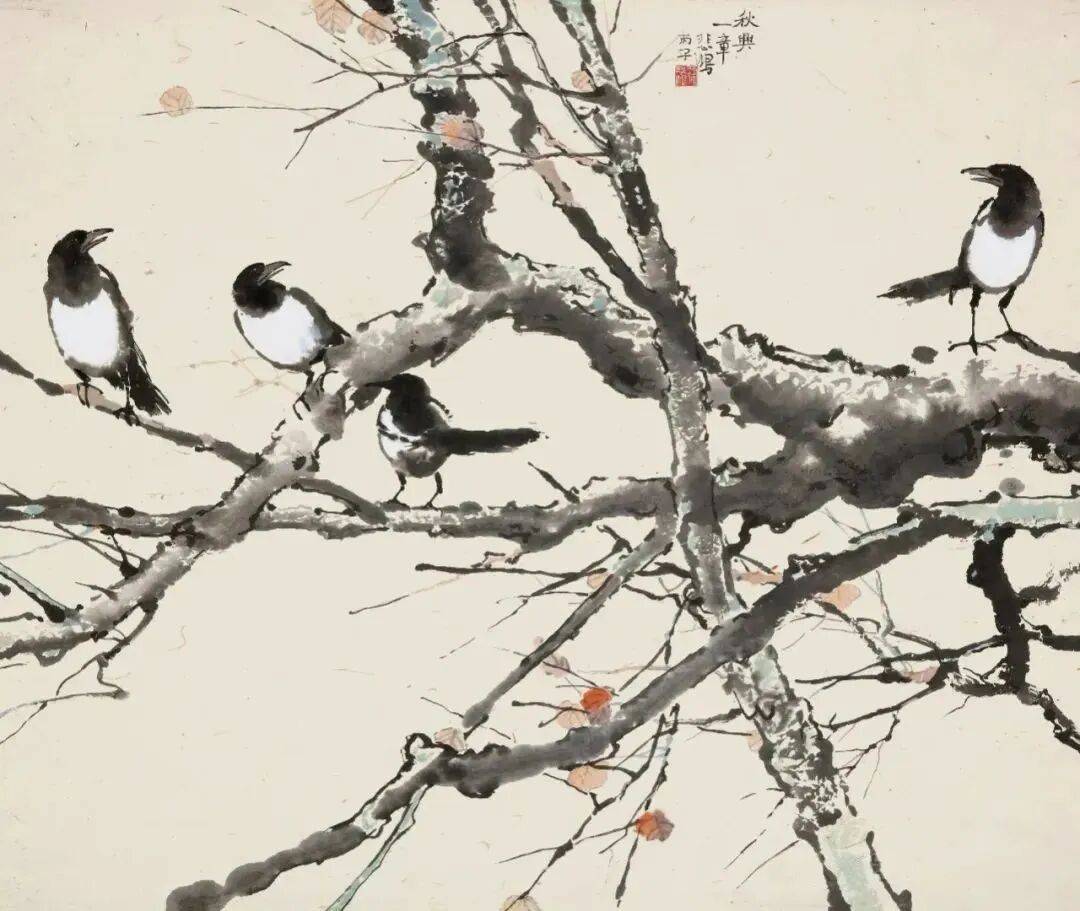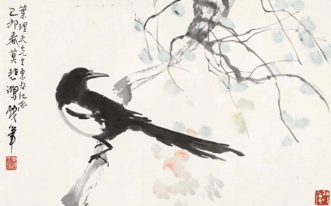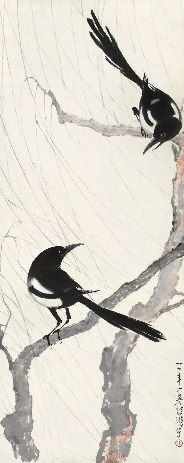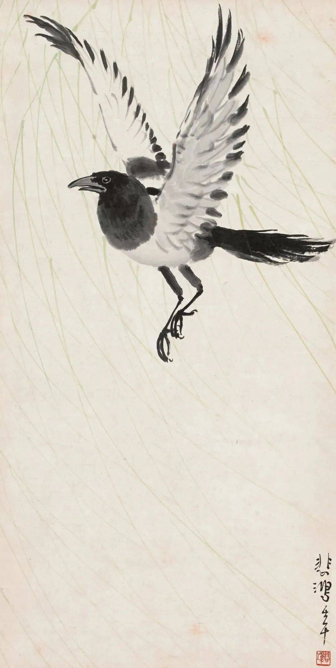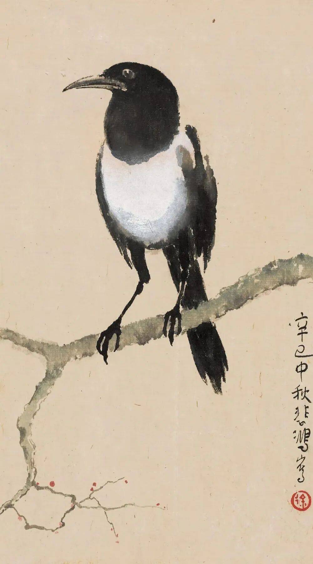 徐悲鸿主张“师法造化”,强调对物象解剖结构的精准把握。他笔下的喜鹊: