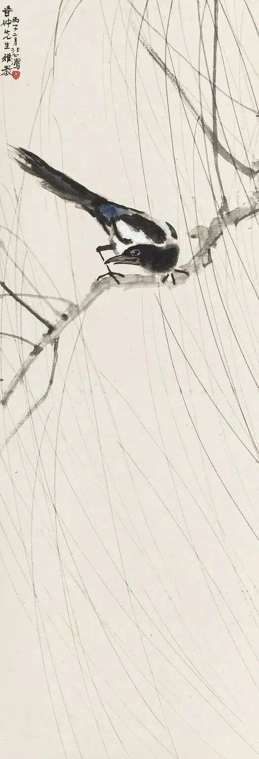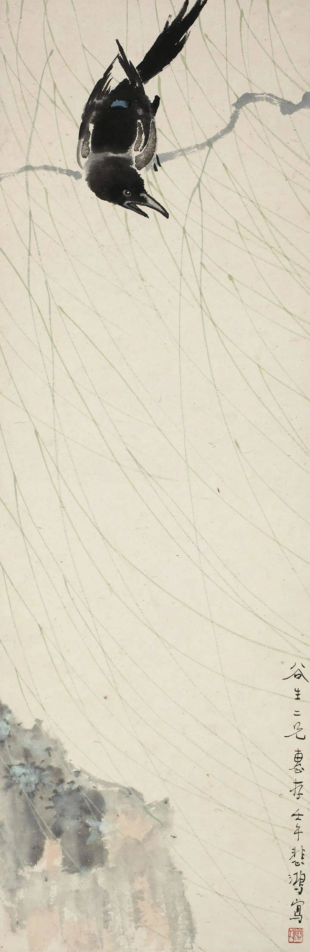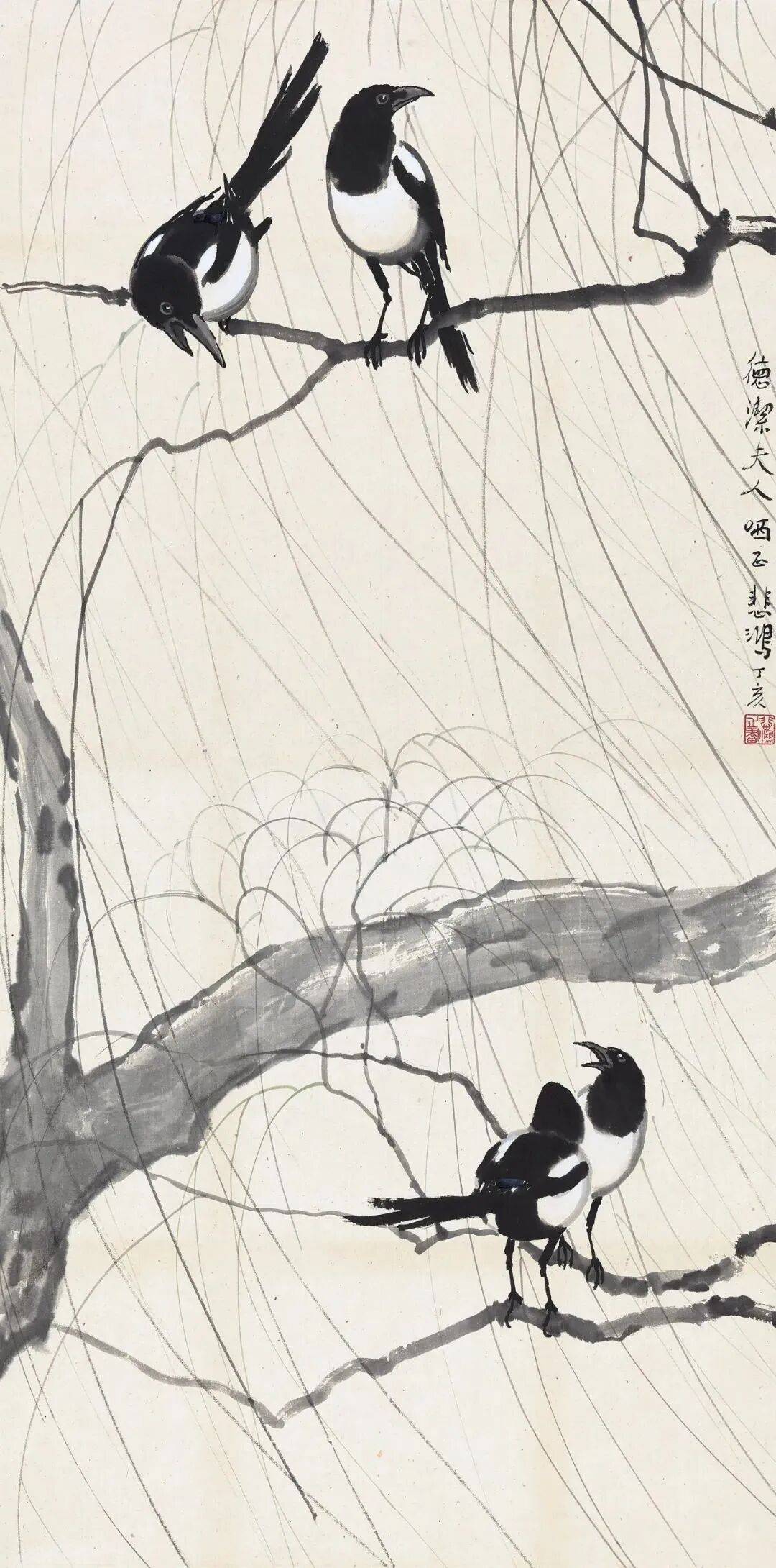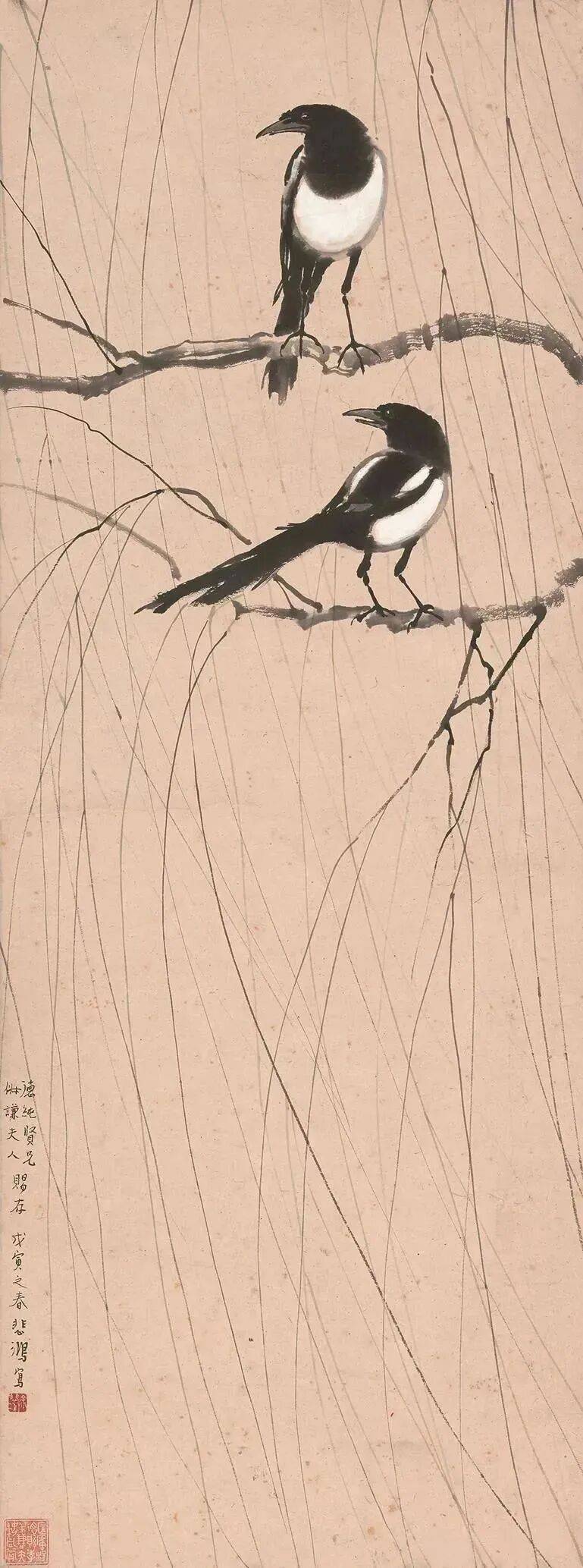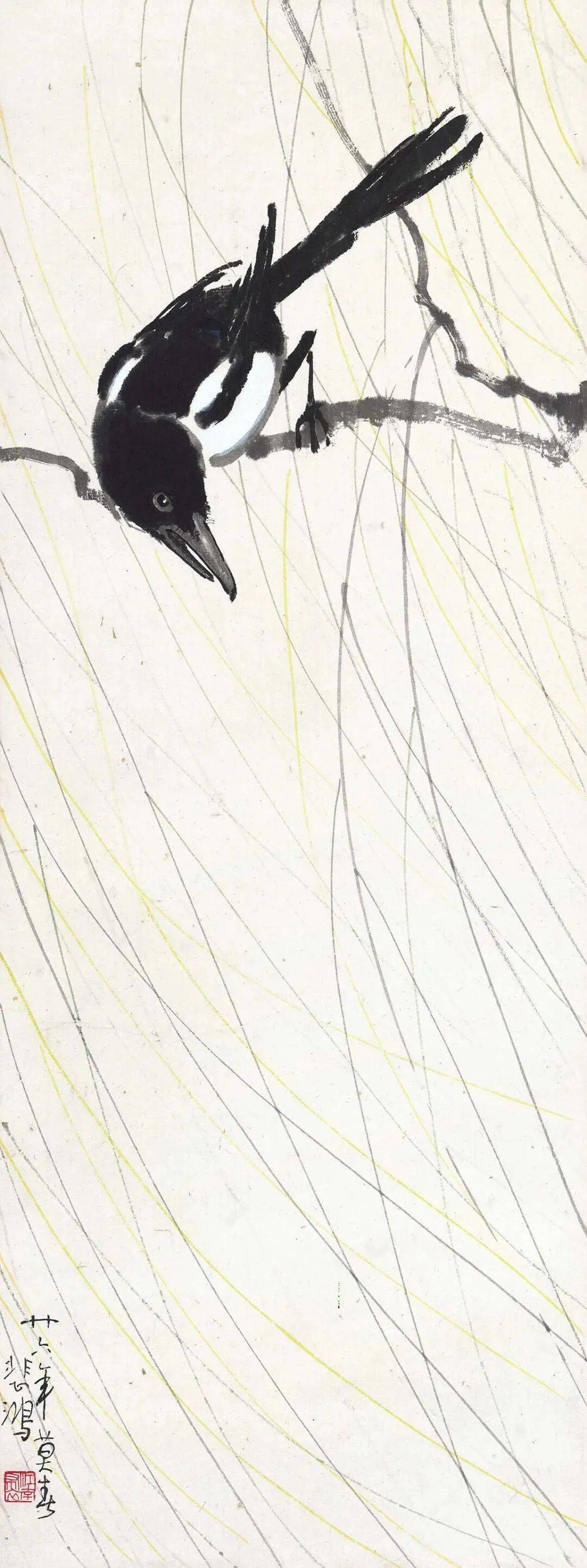 徐悲鸿先生不仅擅长画马,他亦创作了大量喜鹊题材的作品,先生笔下的喜鹊活泼灵动,惟妙惟肖,让人喜爱。而简洁的构图,疏密有致的柳枝、红梅穿插其间,更是呈现一派生机,让人感觉到生命的律动跃然纸上。