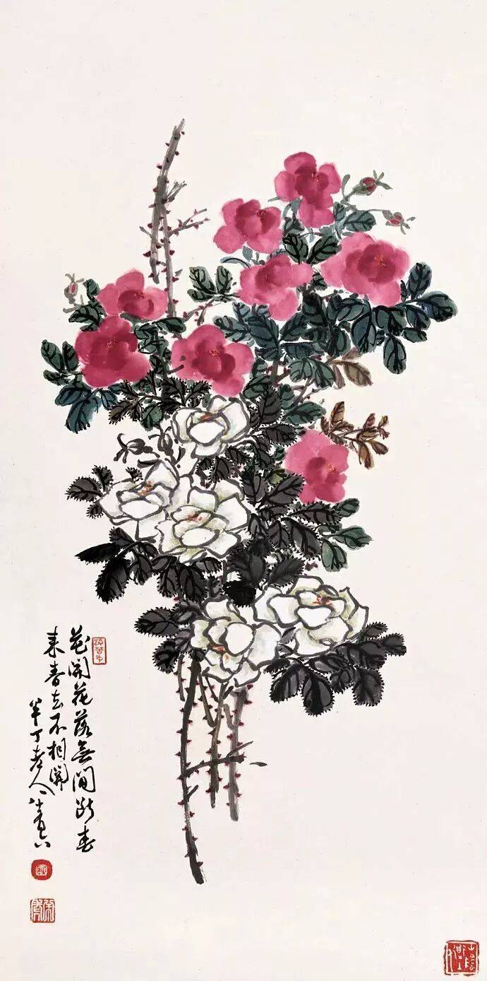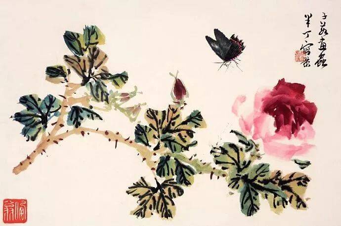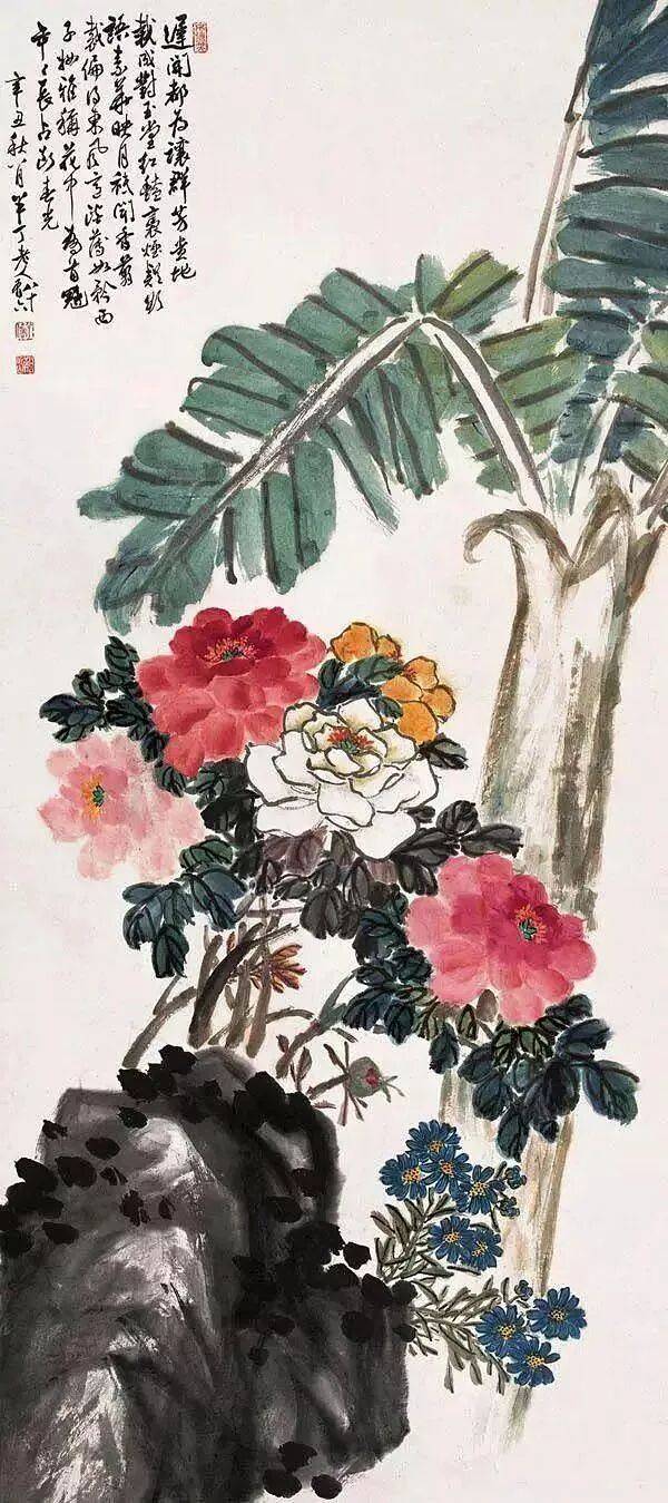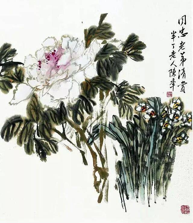 陈半丁是一个“兼宗数家者……能兼蓄并收,不限一格,不拘一隅……能脱去一个人的羁绊采取众人的所长,因所习既多,自然能将名家于不知不觉中参合为一,以形成自己的面目”。陈半丁的花卉主调是“陈白阳再加吴昌硕”,他将吴昌硕、赵之谦金石书法的苍劲寓于画中,将华新罗的清俊,金冬心、汪士慎的疏放掺杂进去,同时习得青藤、白阳的水墨淋漓,所以他的花卉画中少了几分吴氏横扫千军的霸气,多了几分俊秀清新润泽,老练而不重拙,清秀而不怯弱。