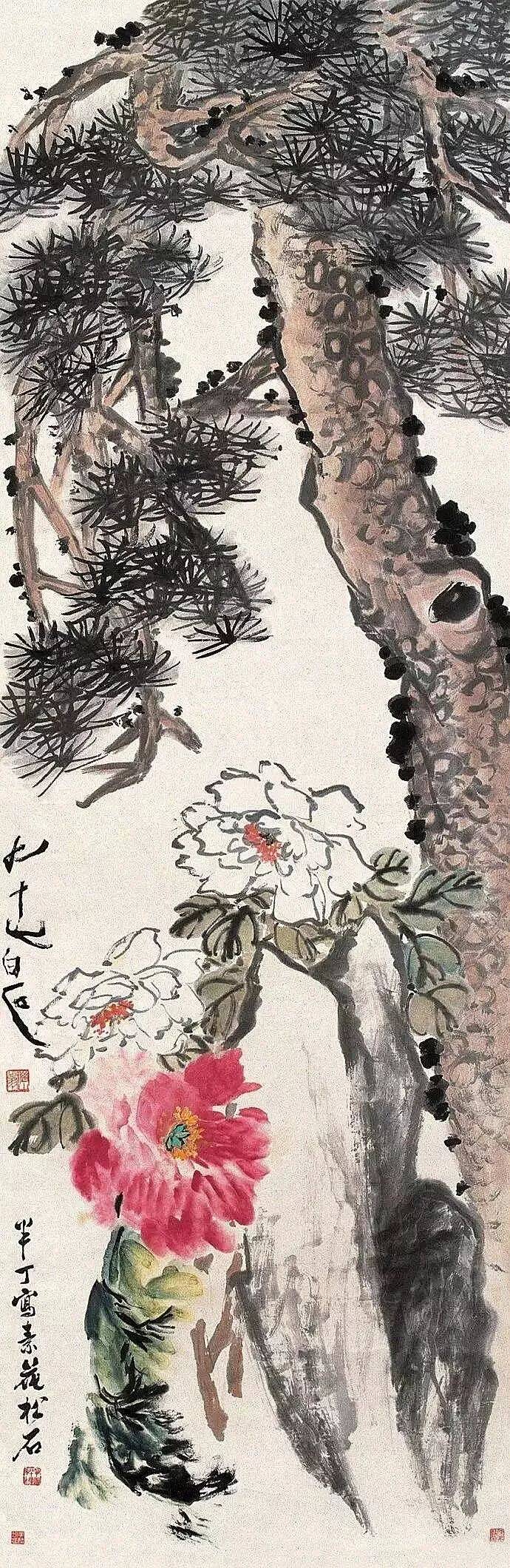 陈半丁善于运用折枝构图,截取一枝独秀,突出主体神韵。画面常将诗、书、画、印有机统一,布局稳重而不失奇巧,营造出富有文化内涵的艺术空间。例如《松树牡丹图》中,松之坚毅与牡丹之华美相映成趣,象征长寿与富贵并存。