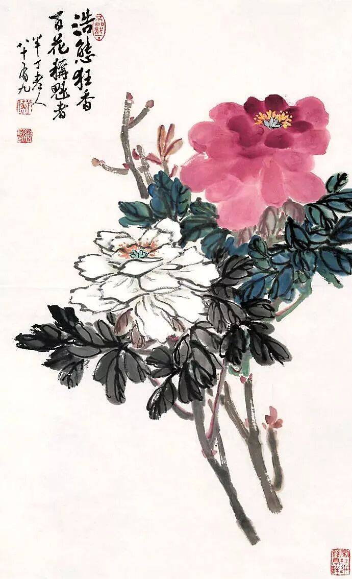 陈半丁是中国近现代著名的花鸟画大师,尤以画牡丹著称。他的牡丹作品融合了海派与京派艺术之长,在传统笔墨中注入个人风骨,形成了苍润朴拙、清新明丽的独特风格,被誉为“运古派”的代表人物之一。以下是其牡丹绘画艺术的核心特点: