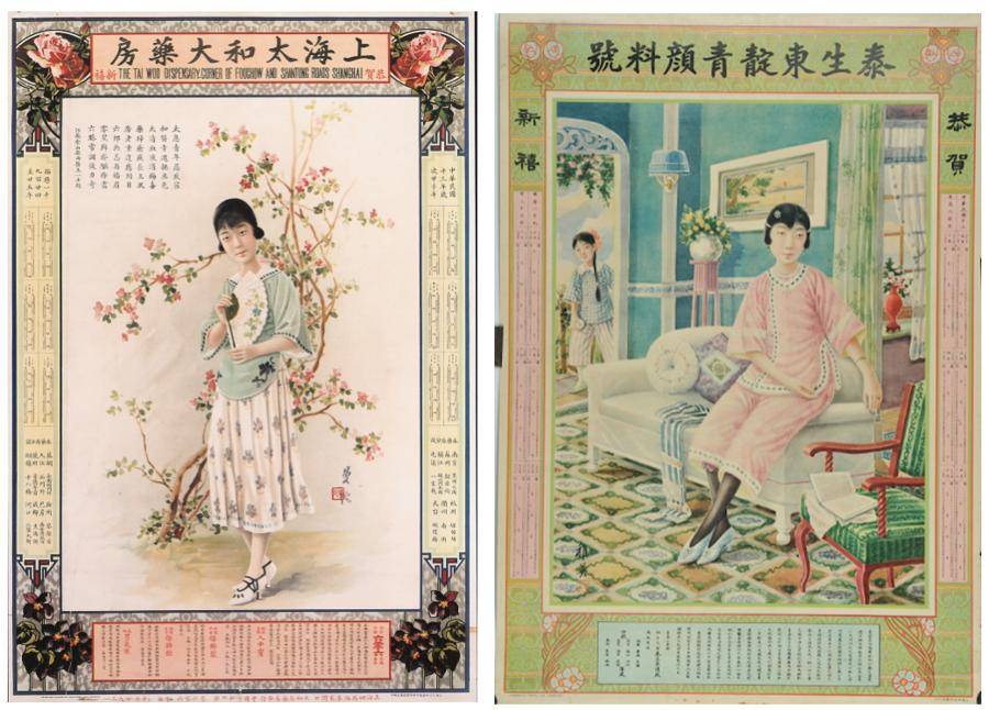 上海太和大药房月份牌和泰生东靛青颜料号月份牌。上海市历史博物馆藏