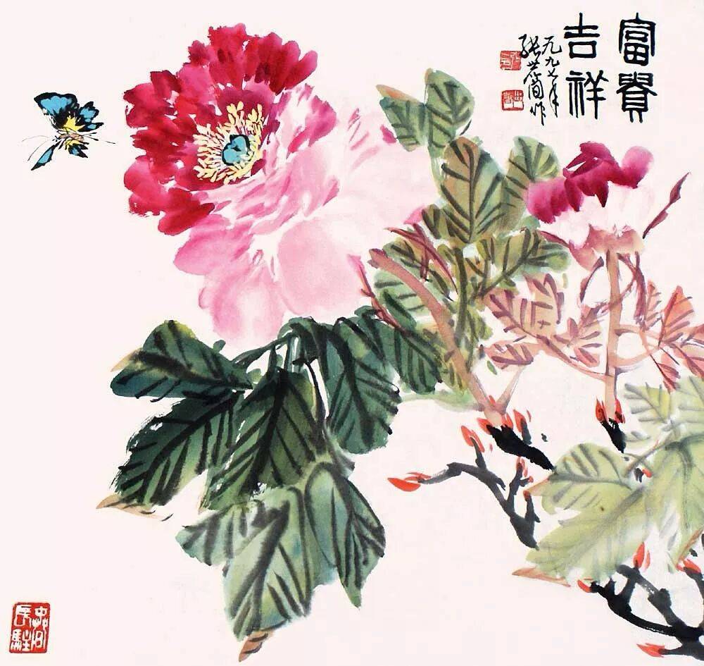 张世简深谙齐白石“妙在似与不似之间”的艺术理念,其牡丹既保留了物象的真实感,又注入主观情感与意境表达。他笔下的牡丹不拘泥于外形复制,更注重传达富贵吉祥、生机盎然的精神气质。