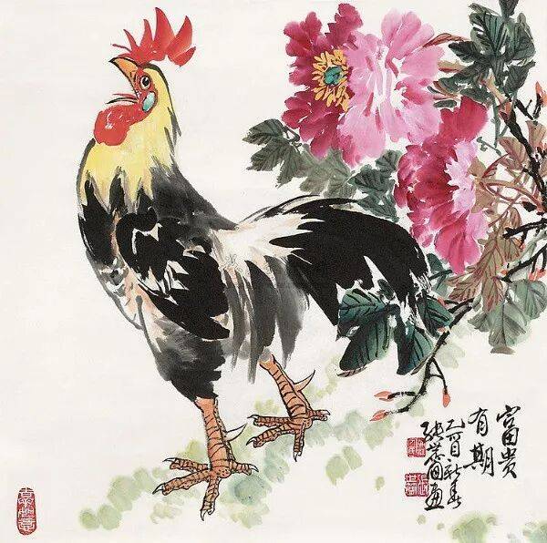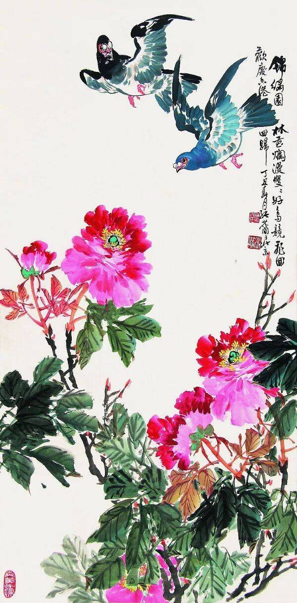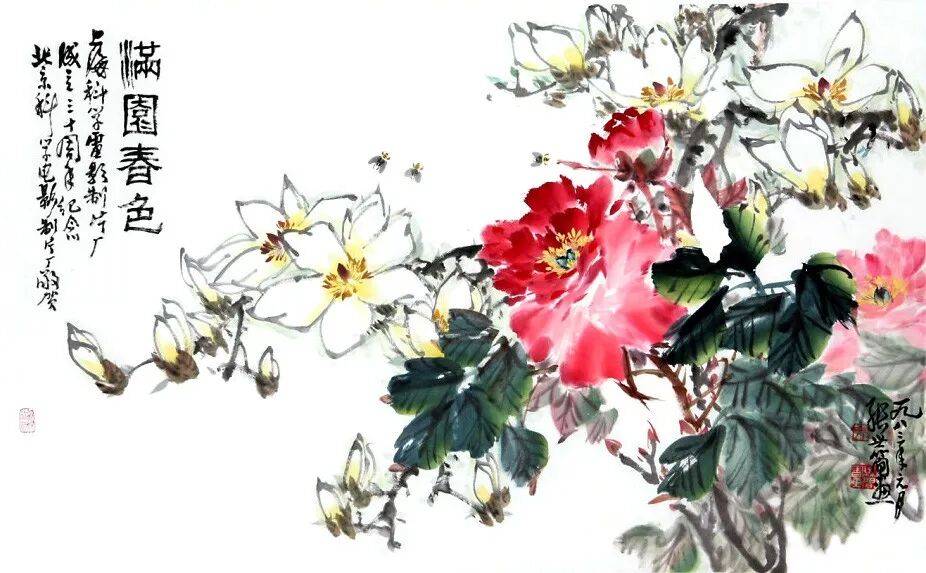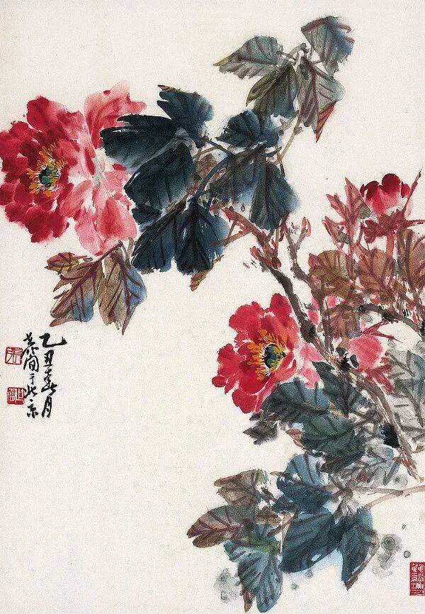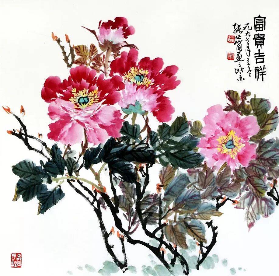 他善于运用丰富而和谐的色彩,如淡粉至深红的渐变,表现花瓣的层次与光影,犹如晚霞映照,又似少女含羞,呈现出“艳而不俗,清新自然”的视觉美感。同时,其用笔刚健有力,线条富有节奏,枝叶穿插讲究疏密有致,体现出“老将用兵,沉着周密”的章法功力。