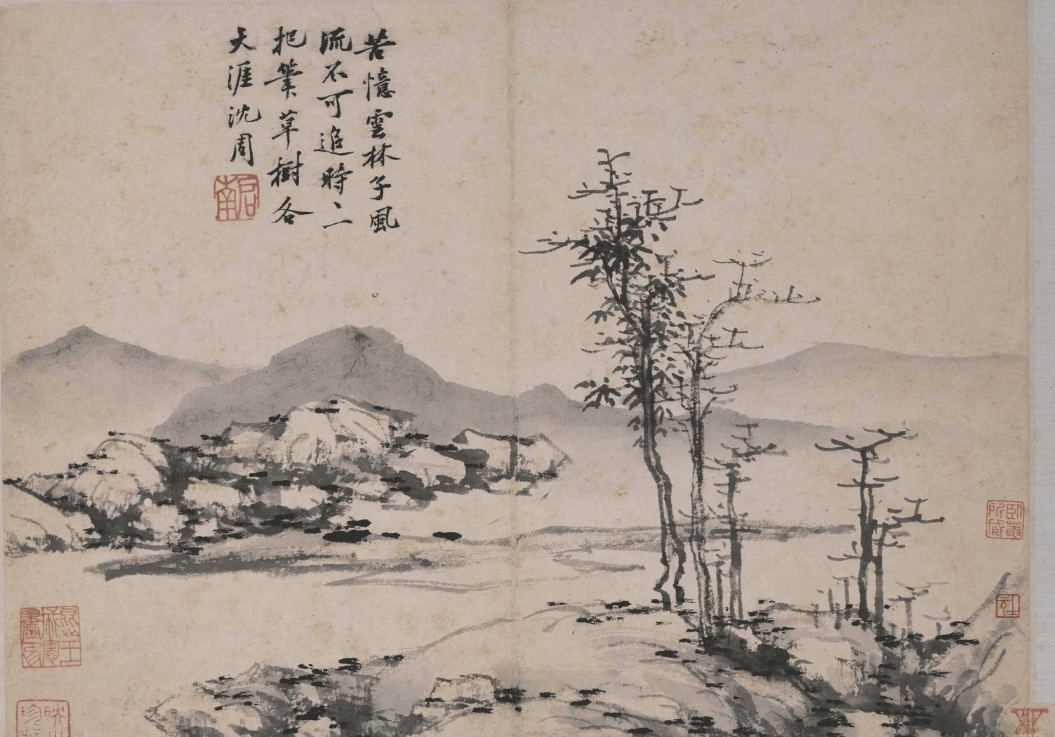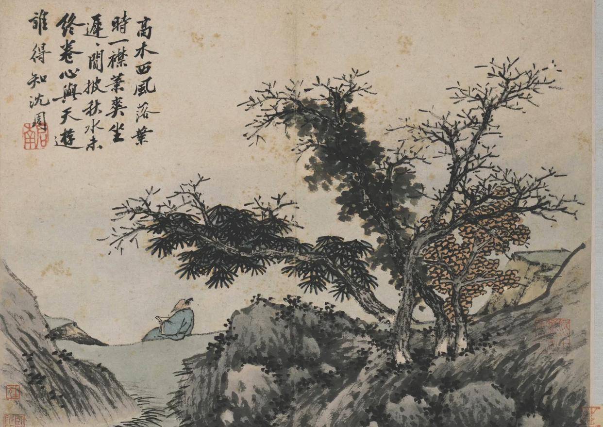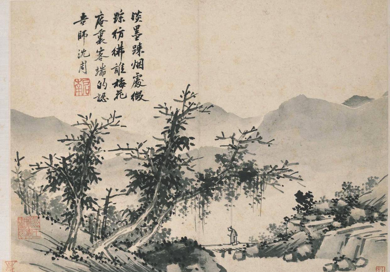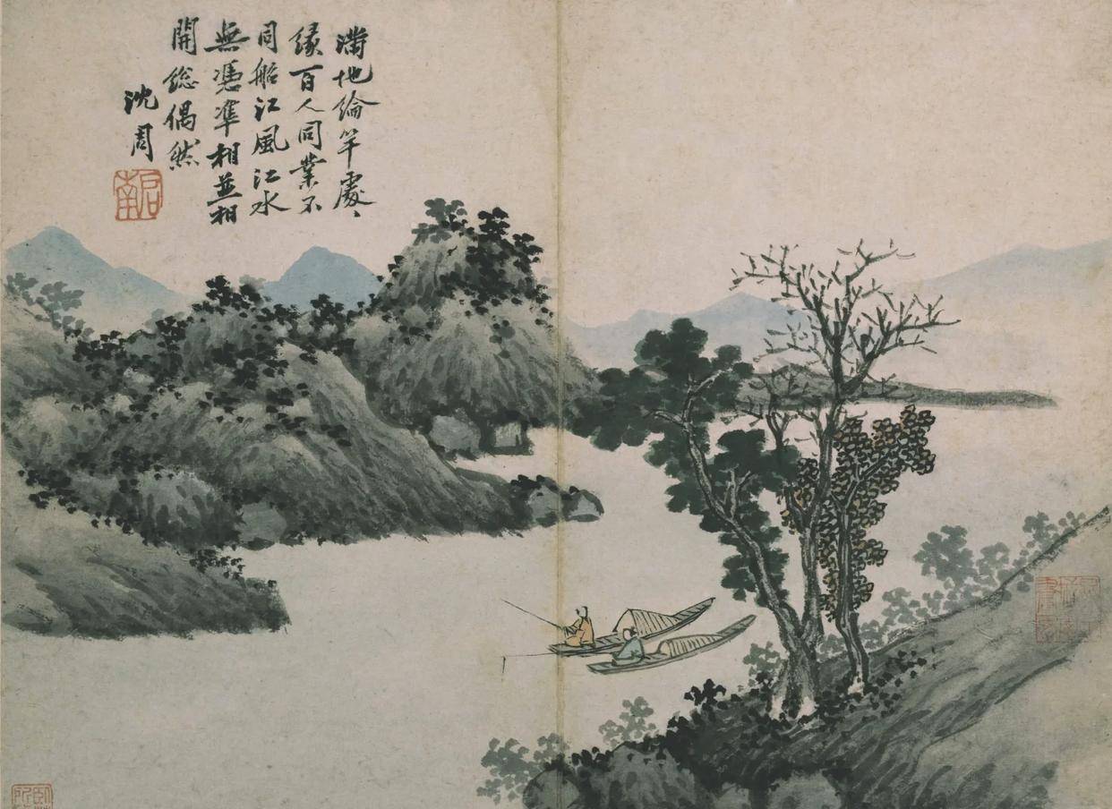 沈周的山水,从来不止是山水本身,更是文人精神的载体。他一生不仕,隐居江南,以诗画为伴,将对自然的热爱、对生活的感悟、对人生的思考,尽数融入笔墨之中。他的画里,没有宫廷画的富丽堂皇,没有浙派的刚劲狂放,只有江南山水的温润清雅,只有文人雅士的闲适旷达。诗画相融,笔墨相生,他以书法入画,让笔墨更具韵味;以诗文配画,让意境更显深远,真正践行了文人画“诗书画印”一体的美学追求。