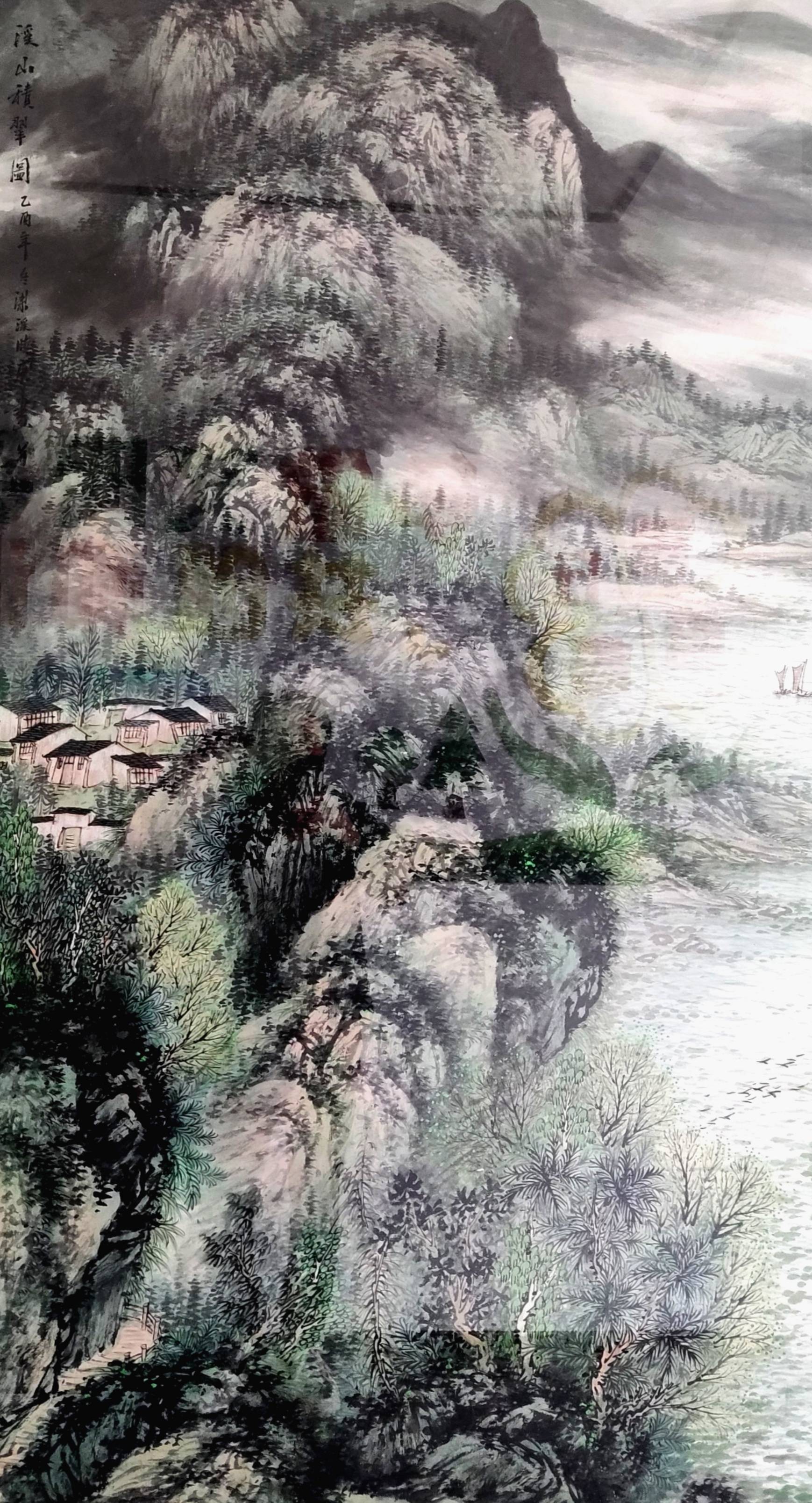 画面中的山石、溪水、林木,都不是对自然物象的简单复制,而是经过画家主观提炼与重构的心象表达。他通过笔墨的运用,将自己对江南山水的记忆、对家园的眷恋、对传统的理解,都融入到了画面的每一个细节之中。这种“外师造化,中得心源”的创作理念,使《溪山积翠图》超越了单纯的风景再现,成为了一幅承载着深厚人文精神与哲学思考的当代艺术作品。