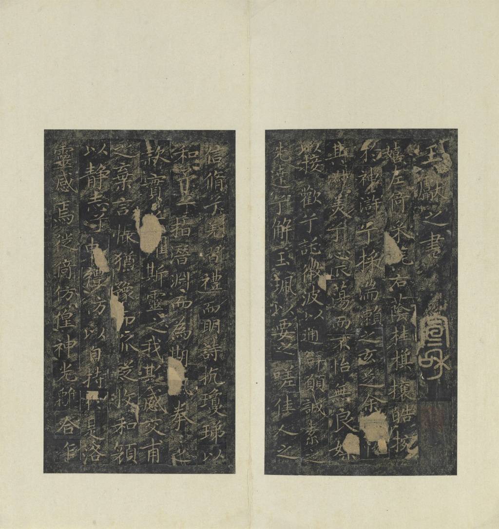 《洛神赋》为曹植(192-232)所作,内容叙述作者本人于洛水偶遇洛神、相恋,最终因人神殊途而离别的爱情故事。王献之书《洛神赋》原迹不存,宋代以来拓本仅存十三行,后人誉为小楷极则。本幅为蓑衣裱,也是古代刻帖常见的装裱技法之一。