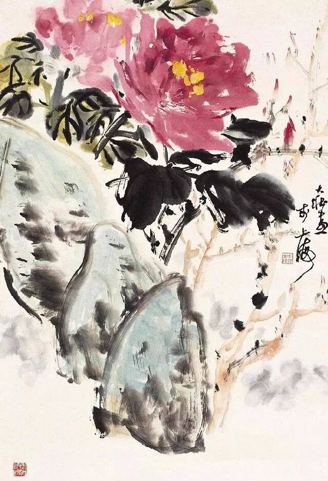 张大壮的牡丹给人的感觉是相对比较简单,但用笔比较自如,用色用水比较饱满,从而达到了一种韵味十足的艺术效果,他的牡丹给人的感觉并不俗气,而是变得更加高雅,他的用色多掺杂了墨,所以颜色并不艳丽,而是变得典雅,他画的枝干多用墨来写就,或者是配花青来绘制。形成了比较鲜明的个人艺术特色。