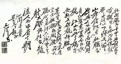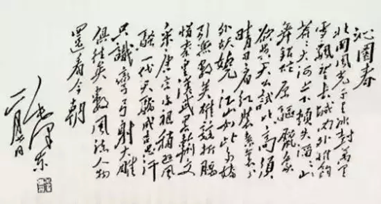 1936年2月,毛泽东率领红军抗日先锋队红一军团和红十五军团渡过黄河,东征华北前线对日作战,途经陕北清涧县袁家沟一带,适逢大雪,于是写下气势磅礴、雄壮豪放的《沁园春·雪》。当时,毛泽东手书该词后,曾于落款处钤有一方白文“毛泽东印”。