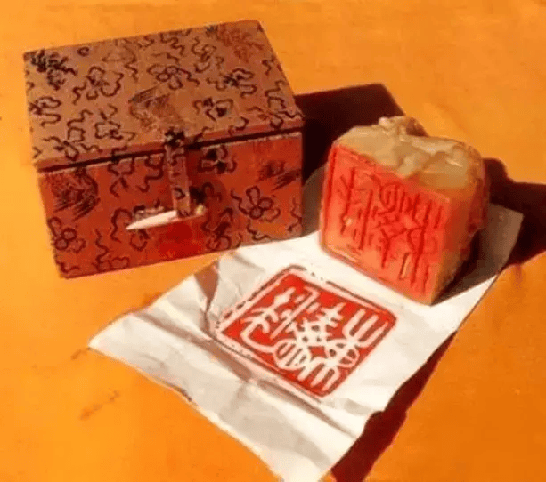 这件作品是在1963年8月赠给毛主席的。大印呈立方体,明黄色,顶部镂空琢双龙,因此又称“龙纽大印”,印的一侧刻有“1963年8月,敬献毛主席,散木瑑时六十有六”。