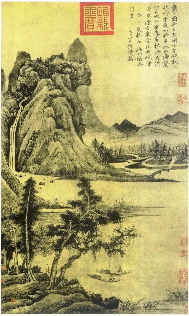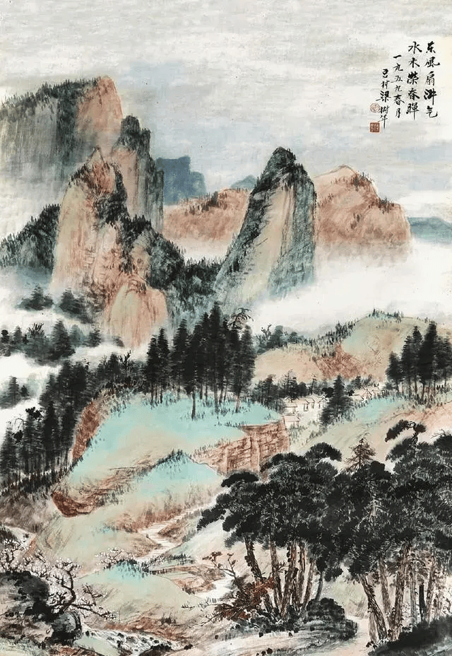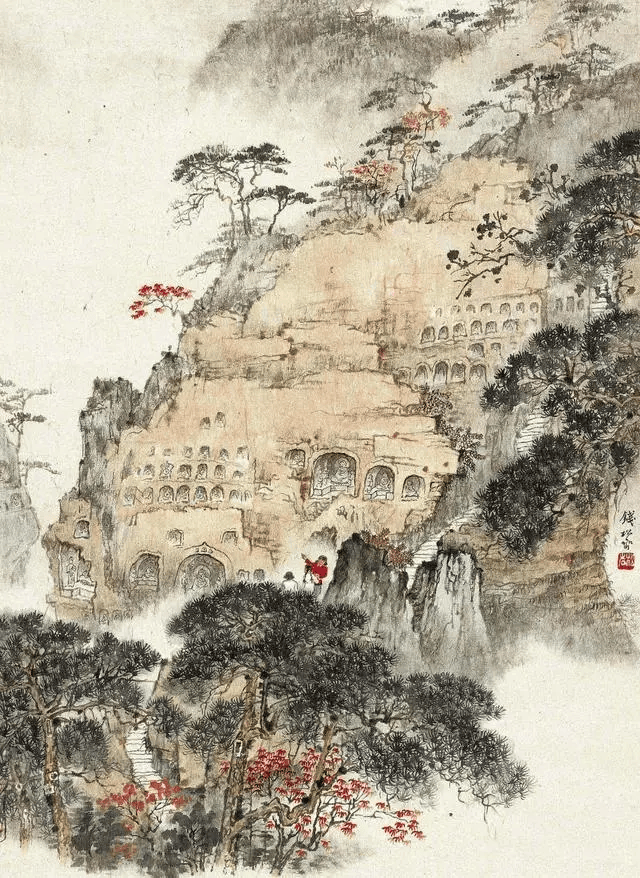 在一幅画之中,分成几个段落,大致分成两个段落,上段主调用冷色,下面一段可以考虑用热色,但是主调虽然不同,也要得到统一。两者之间,可用一些中间色作媒介,传统用掩盖性矿质颜料,每多在设冷色之前,用热色打底,如上石绿用赭石打底等等。一一《山水画刍议》