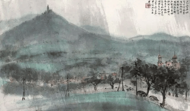 雨景画法,可以先用排笔饱蘸墨青水,在纸上平行地画一二寸许阔条条,一条深,一条浅,相互问隔,但界限不太明显,等干之后,可用转深墨于淡条条处,画上树石、屋宇、桥梁、人物等。两边入于深条处,渐隐不见。其草书画法,与画风相同,顺逆横斜,以蓄其势,点缀人物,可画雨具,迎风而上,以增加气氛。一一《山水画刍议》