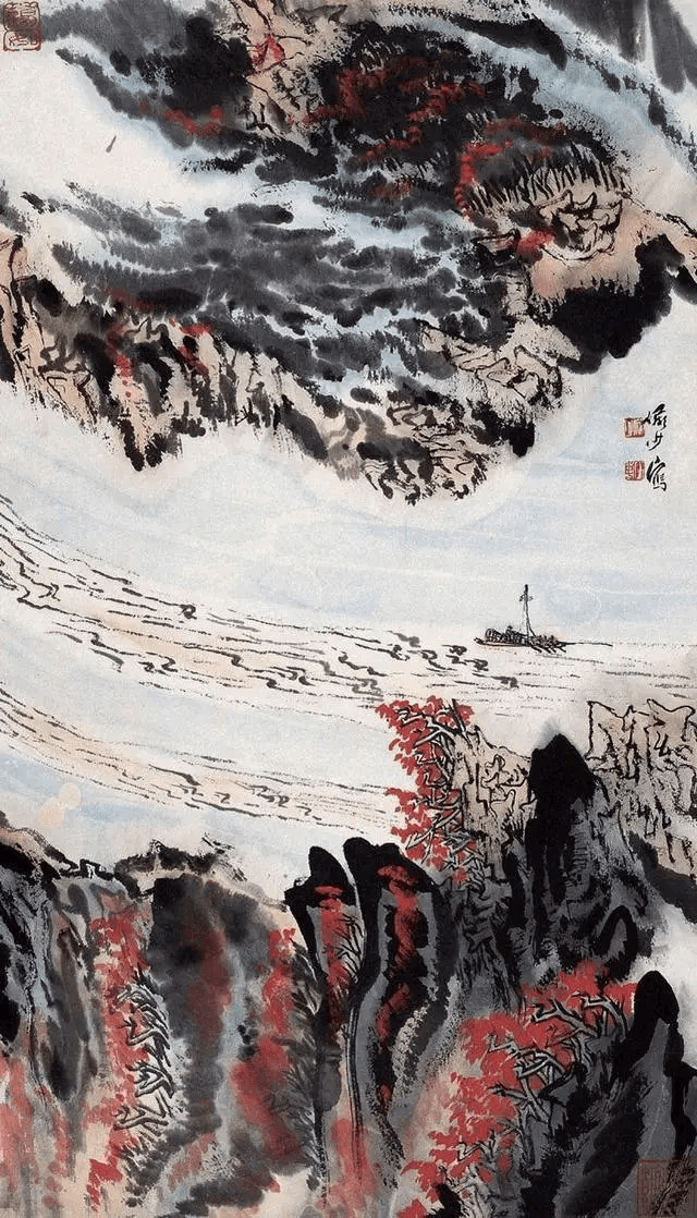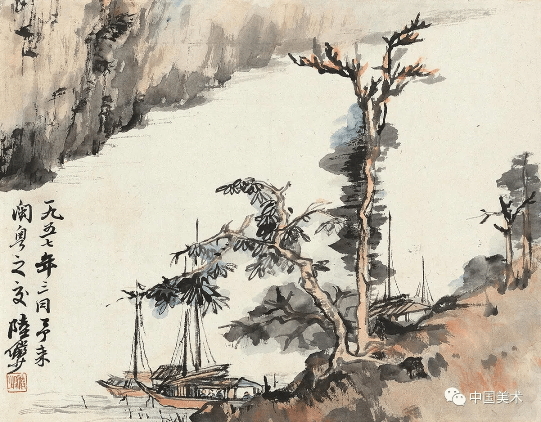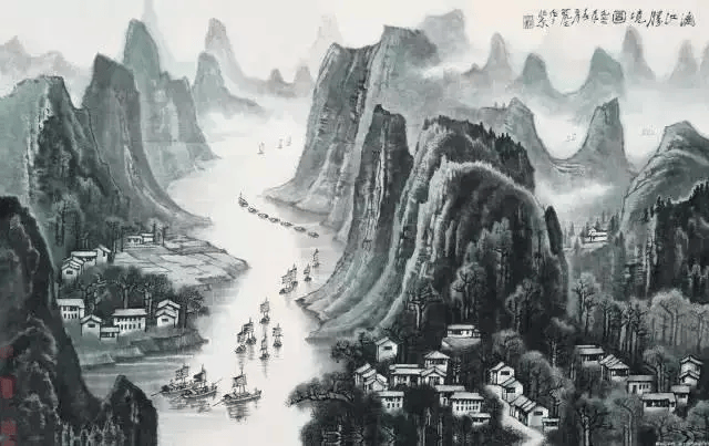 江水浩瀚东去,一泻千里。当今三峡之中,虽经整治,但礁石暗滩,不能尽去。洄流曲折,甚至形成漩涡,漩涡之旁,涌出水沫,画时留出空白,以破江水之平。一一《山水画刍议》