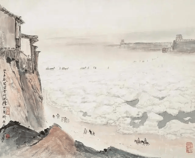 雾中景色,一片模糊,要在模糊中用淡墨勾出物体,近处稍深,远处更淡。切不可用浓墨,浓则失雾之意。画雾不用浓墨,一片淡墨,易失于平。所以只有在笔迹的点线上求其不平。如近处山石用大墨块,近树用粗笔,远树用细笔,加以繁简,疏密、虚实的穿插,同样可以做到不平。画好之后,可用极淡墨水整幅渲染以增加其茫茫的感觉。雾天是没有风的,所以树枝不能有动态,也没有声响,是静悄悄的淡灰色调子。一一《山水画刍议》