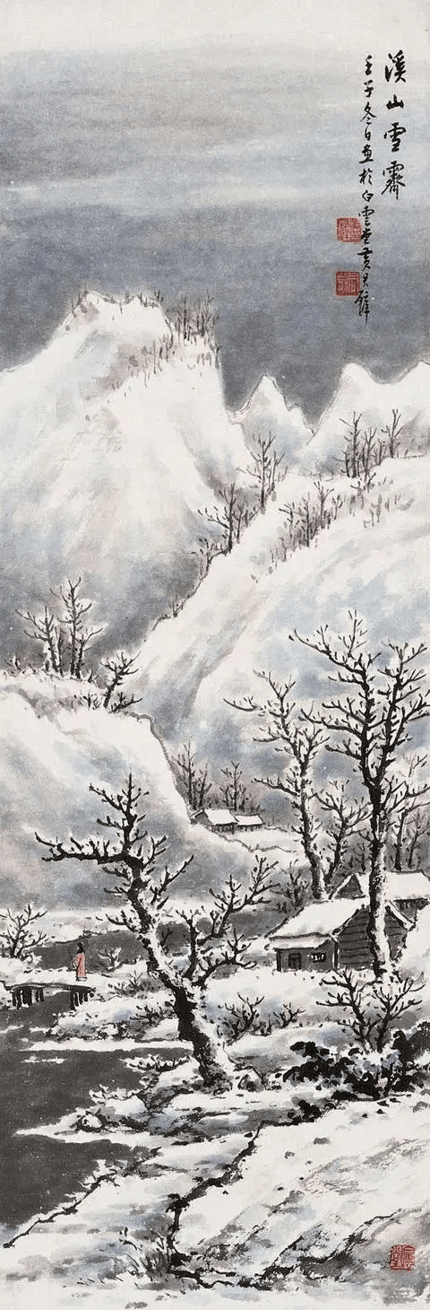 画雪景要善于留空白,空白可染粉或不染粉,白处即是雪,留得好,也就得到雪的精神。传统画雪,不外描写天地阴晦、彤云密布的景色。树木用的鹿角或蟹爪枯树,很少画成绿树。树干上略施淡赭石,其他总是用墨青色或墨色为主调,是一种灰暗的调子,下雪是没有声音的,所以也是静的调子。