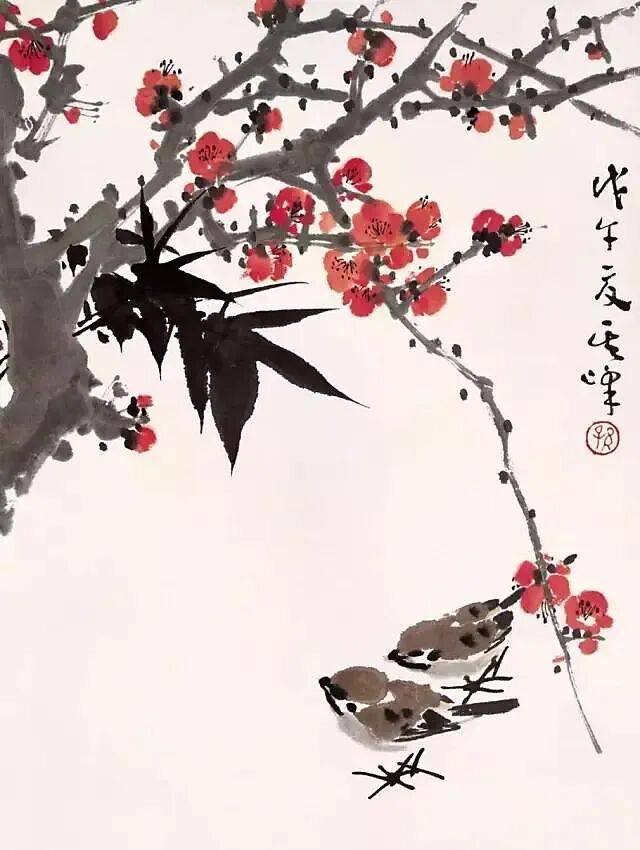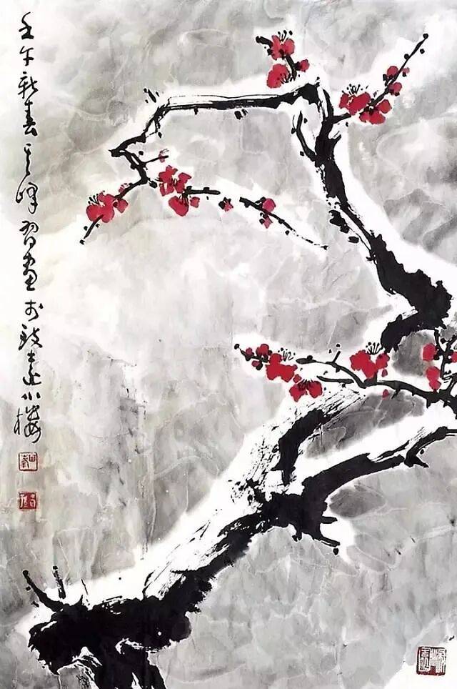 他圈花用笔圆活,能准确表现梅花正面、侧面、背面的不同形态。单瓣花起手练习,复瓣花在外缘加圈即可,注重花与枝的呼应关系。花瓣以淡墨晕染,浓墨点蕊,突出冰清玉洁之感。