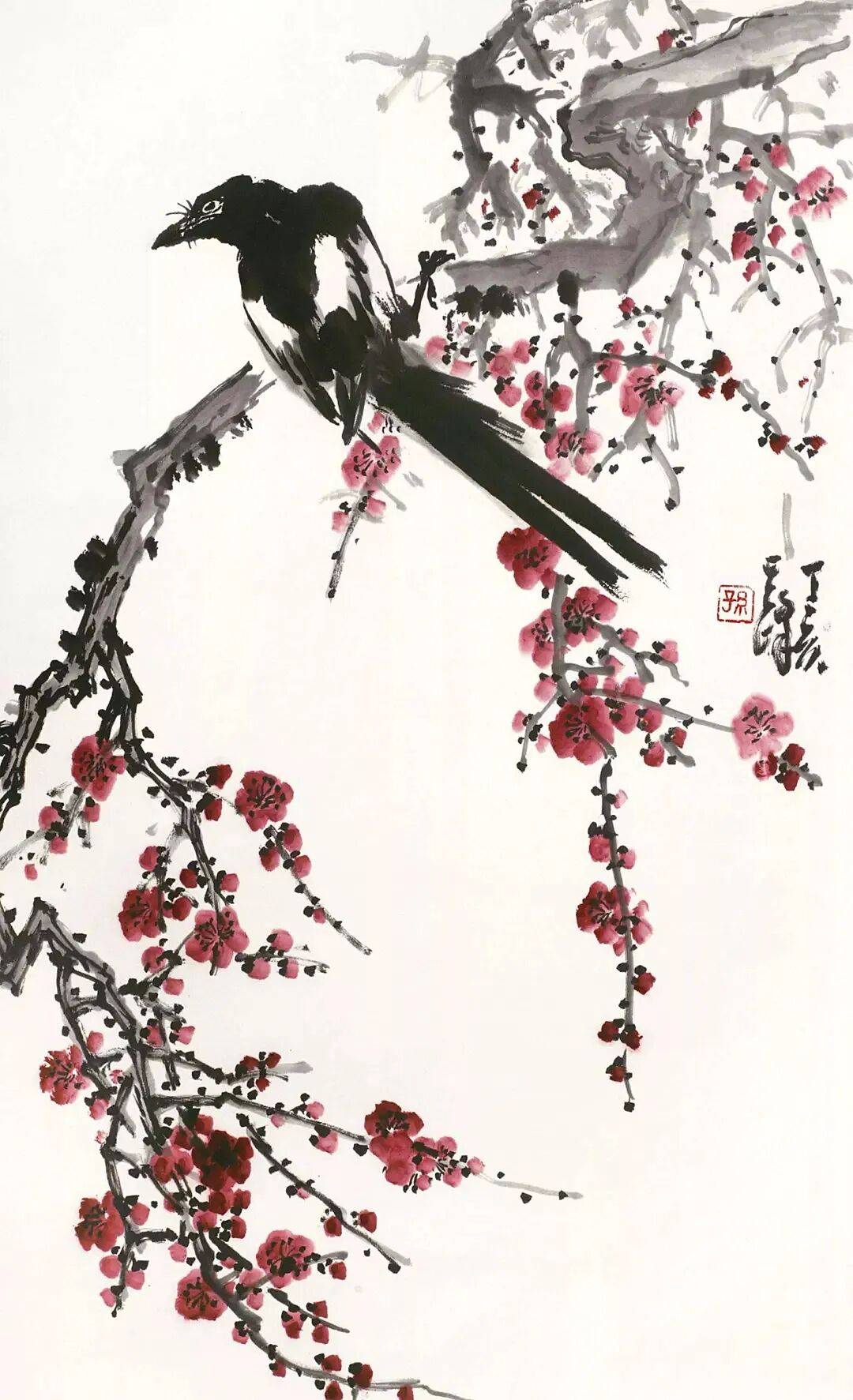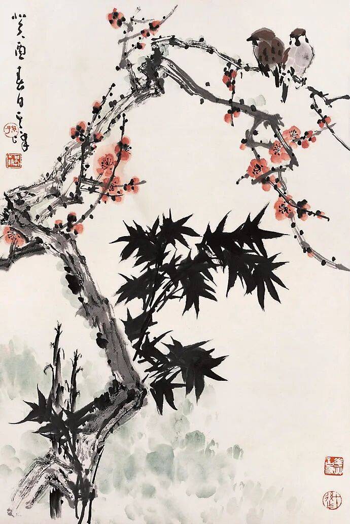孙其峰强调“画梅先画枝干”,认为枝干是画面的骨架。他运用书法用笔入画,线条顿挫有致,通过粗细、曲直、疏密的变化,表现出梅枝历经风霜的苍劲质感。常用重墨勾勒老干,淡墨皴擦新枝,形成层次分明的视觉效果。