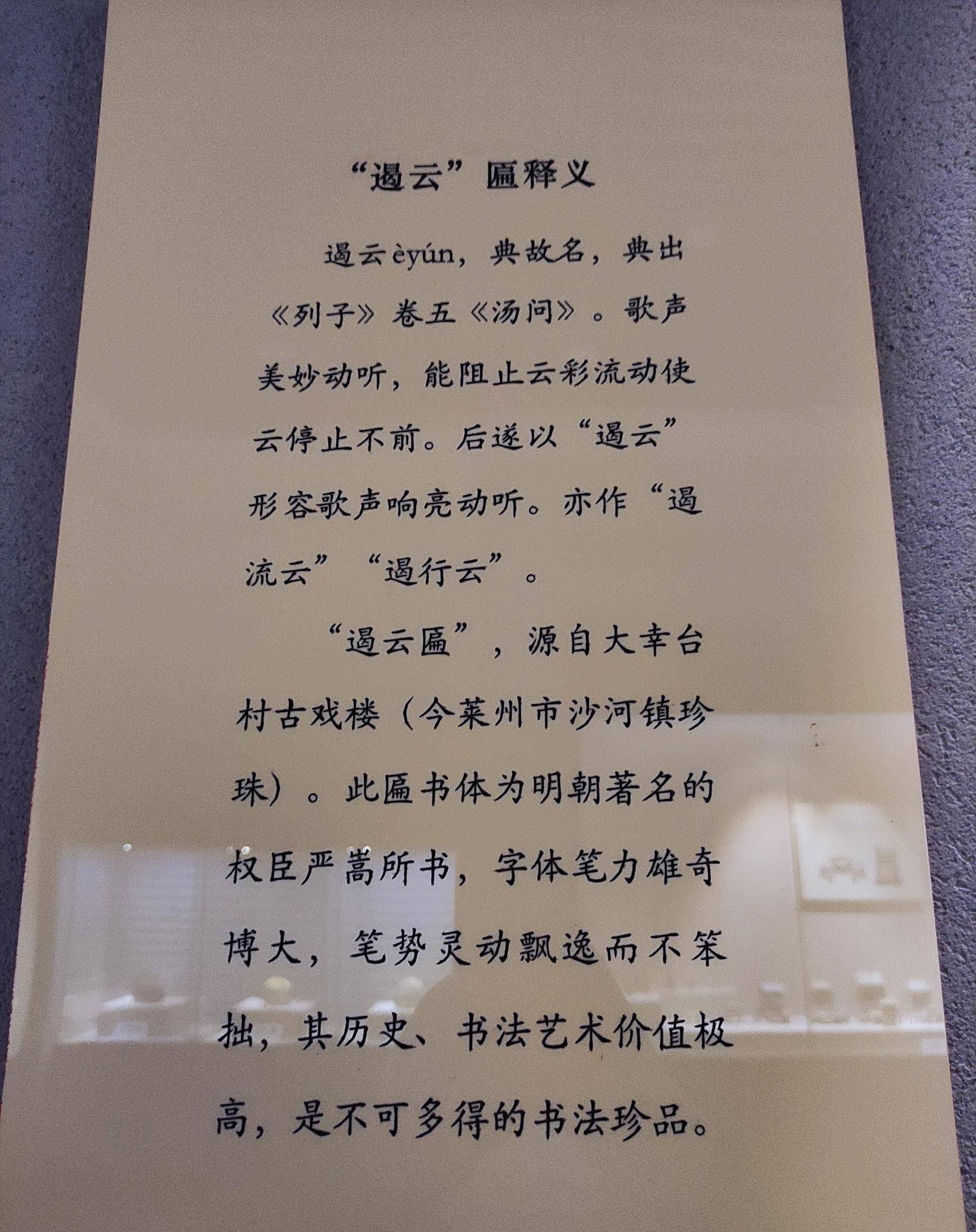 而提到明朝的严嵩,他的书法也是极具特色。在当时,严嵩的手书就被视为珍贵的艺术品,许多文人都为之倾倒。严嵩的字,既有豪放的气势,又充满灵动的变化,给人一种沉稳却不失活力的感觉。他的书法作品,在那个时代常常被视为书法艺术的瑰宝,足见其在书法上的造诣之深。 最近,我在山东省莱州市博物馆参观时,偶然发现了一块名为“遏云匾”的匾额。这块匾额出自明朝权臣严嵩之手,匾额上所书字体笔力雄奇,既有博大的气势,又充满了飘逸灵动的笔势,展现出严嵩书法的精湛技艺。资料中提到,“遏云匾”源自大幸台村的古戏楼,而这座古戏楼如今已不复存在,只留下了这块书法作品作为历史的见证。根据介绍,这块匾额的历史和书法艺术价值非常高,但令我感到疑惑的是,这样一块具有极高艺术价值的匾额,竟然出现在一个乡村的舞台上,实在令人惊讶。