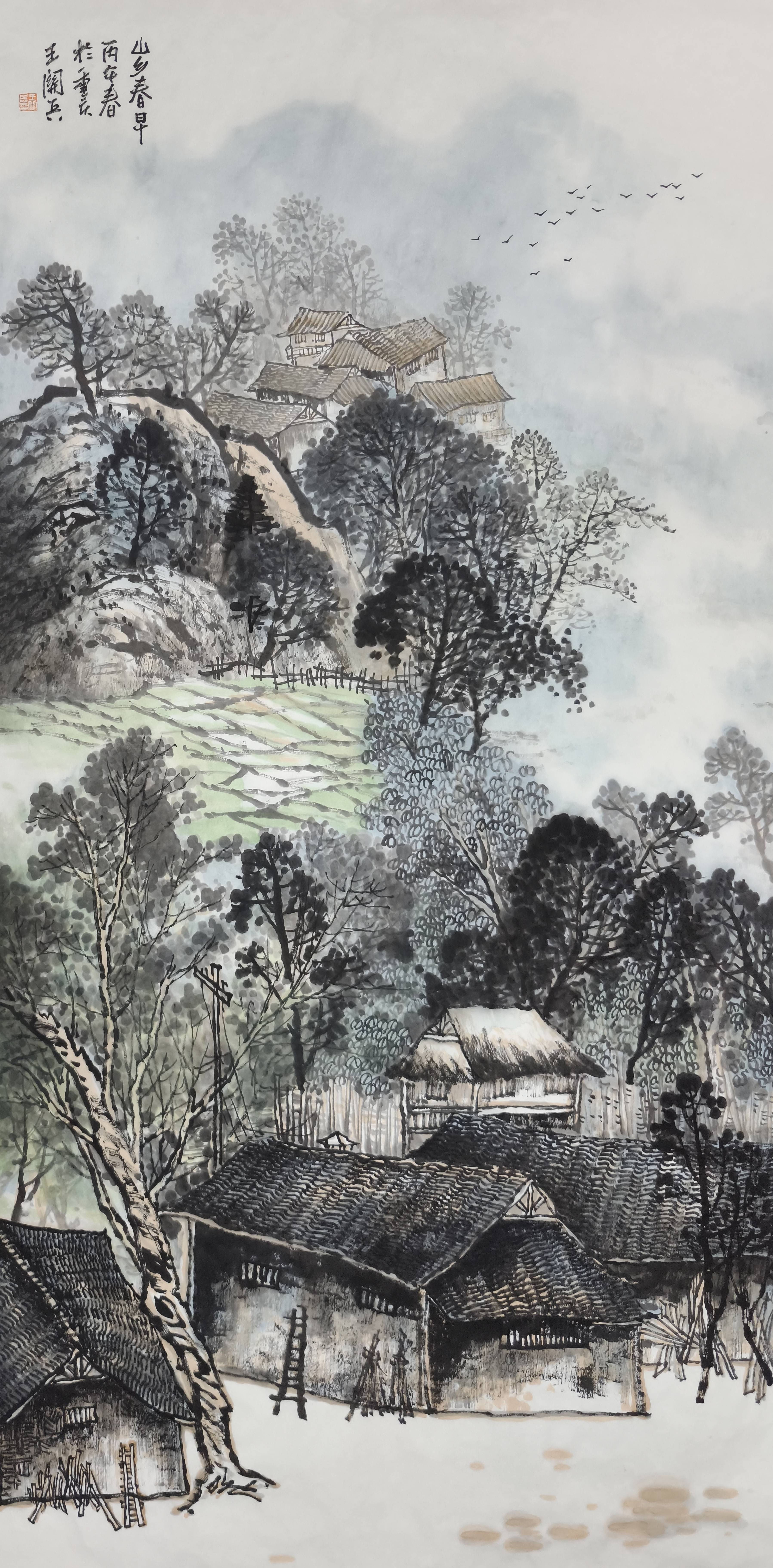 数十年艺海求索,王关兵先生坚守中国画笔墨精髓,博采众长。其山水作品以全景式布局营造恢弘气象,积墨、破墨、泼墨技法娴熟,浓淡干湿相生相发,既得传统山水的苍劲古雅,又具当代审美之灵动新意;人物与花鸟则线条凝练、形神兼备,于细腻处见功力,于写意中藏情怀,形成清新淡雅、气韵生动的独特风貌,作品被业内评价为“巨制点彩、意境深邃,兼具传统韵味与现代构成感”。