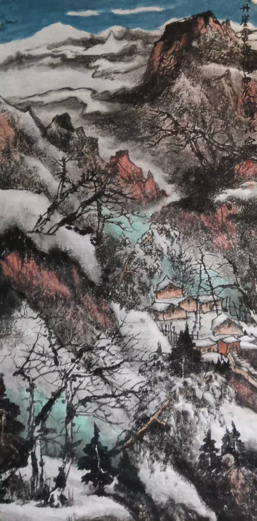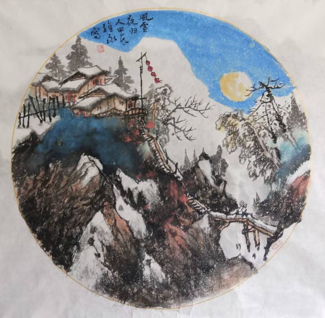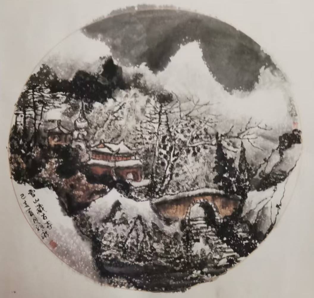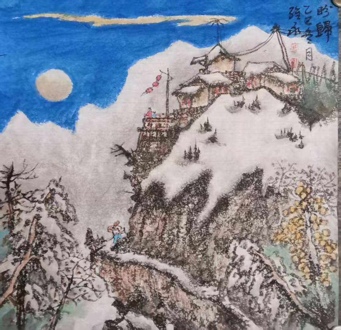 他笔下的雪景,少见孤高避世的文人姿态,多绘村居、老树与寻常行人,烟火气真切自然。雪境并非绝尘的理想幻境,而是有人、有生活、有故事的大地山河,朴素、真诚、温润可亲。其艺术风貌可用真、厚、暖、雅四字概括:真在师法自然、情感质朴;厚在笔墨扎实、意境深沉;暖在用色温润、气息平和;雅在格调清朗、分寸有度。这使其雪景既区别于传统文人画的冷寂孤高,也不流于一味雄强的外在表现,形成雄浑温润、高而鲜活的个人风格。