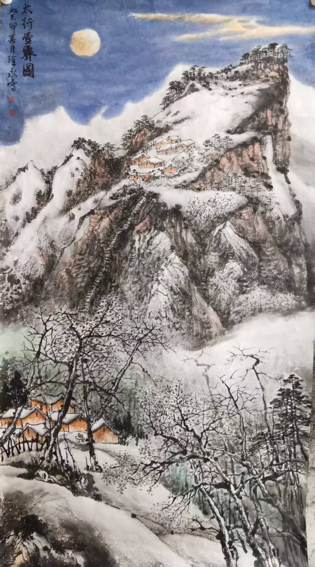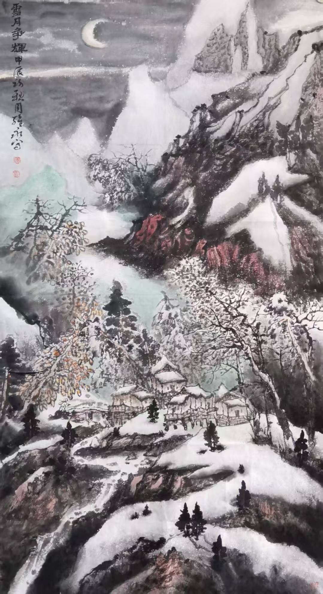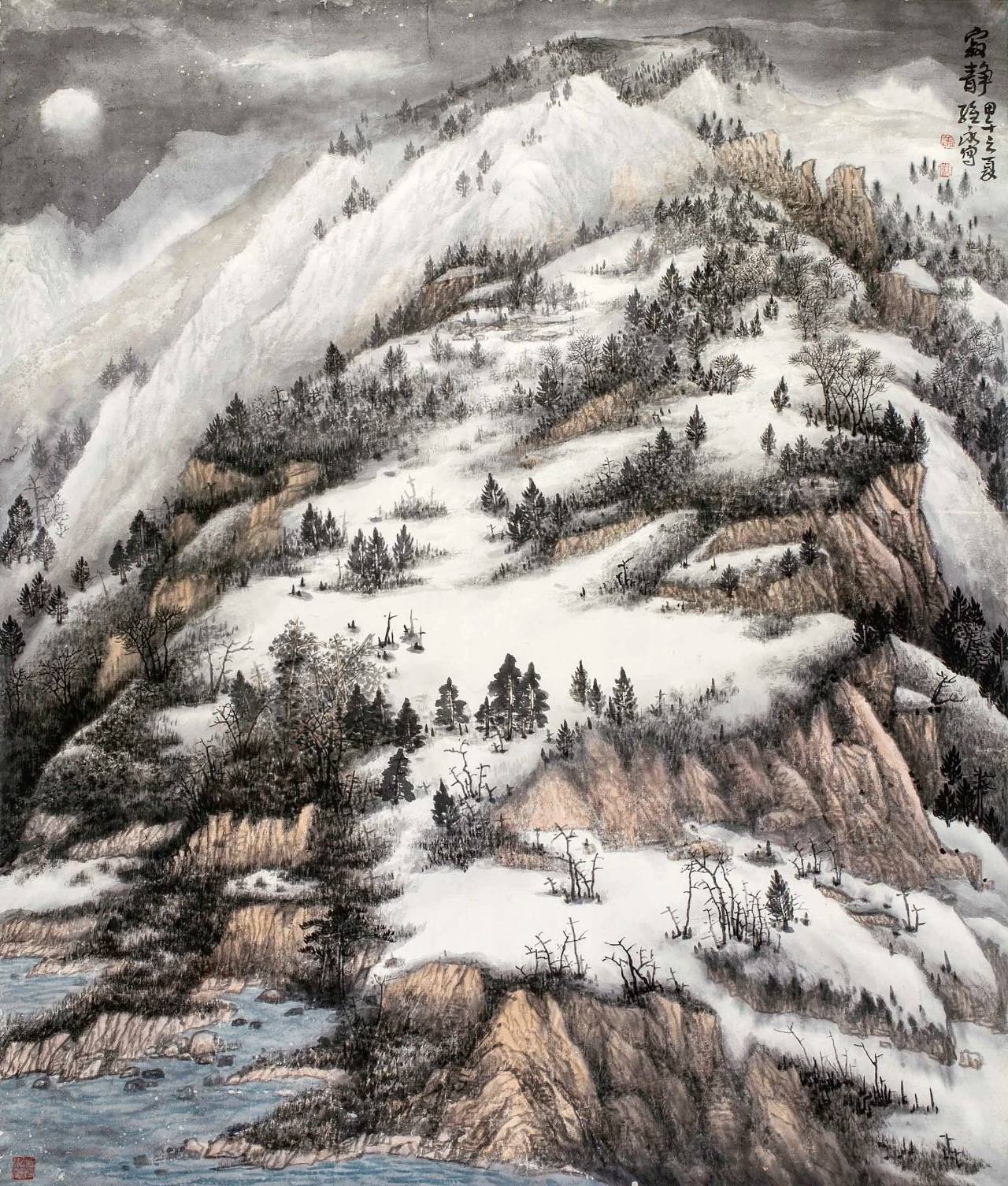 萧维永最突出的艺术突破,是用暖色调调和冷寂雪景,打破“雪景必为黑白清冷”的固化认知。传统雪景多以水墨为主,而他在长期写生中发现,雪后天地并非单色:枝头含青黛,崖石露赭红,晨昏与月色之下更有丰富的冷暖变化。他适度运用朱砂、赭石、石青等色,设色温和、艳而不俗,形成辨识度鲜明的色彩语言,为当代雪景山水的色彩表达拓展了空间。
