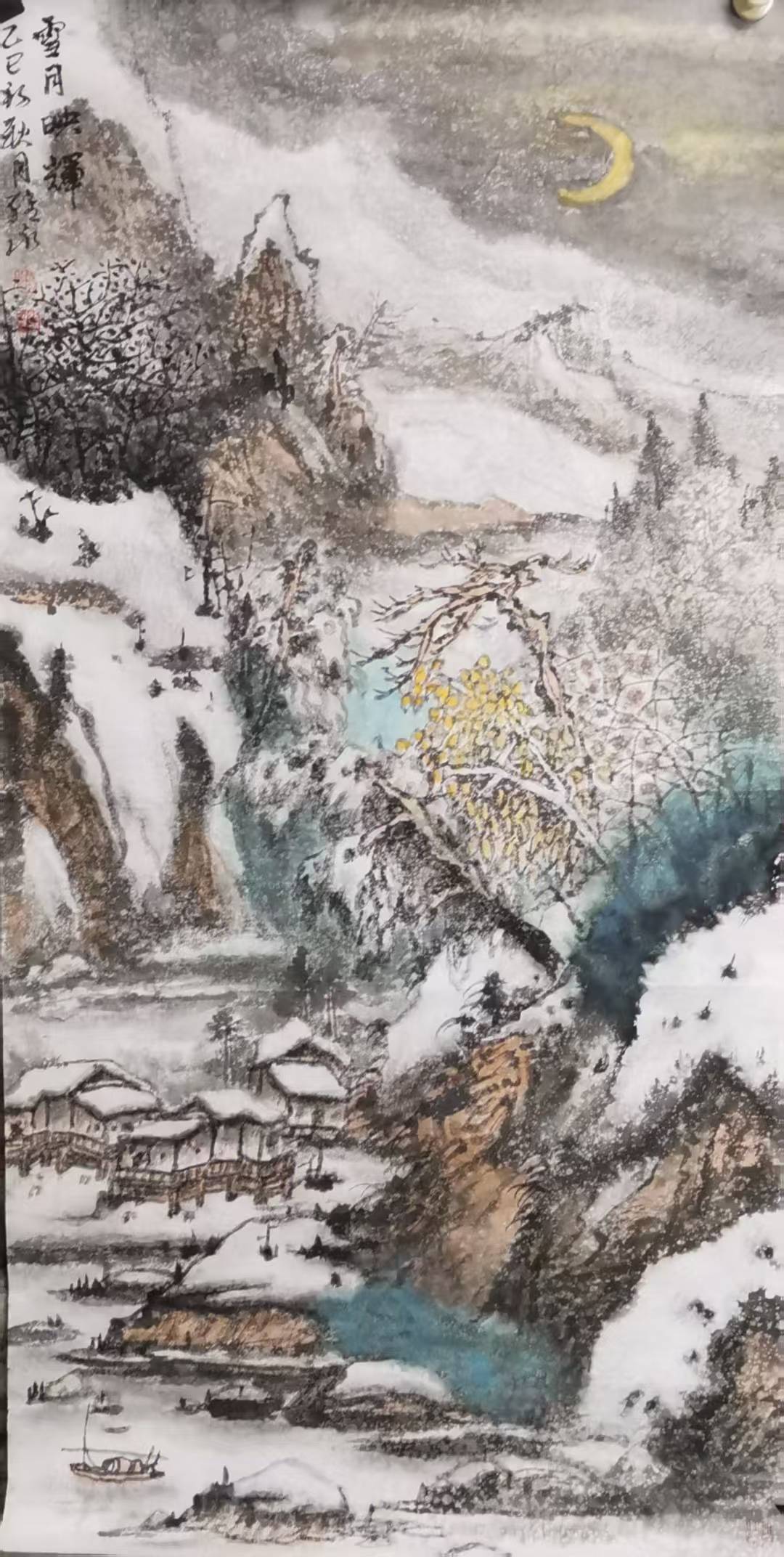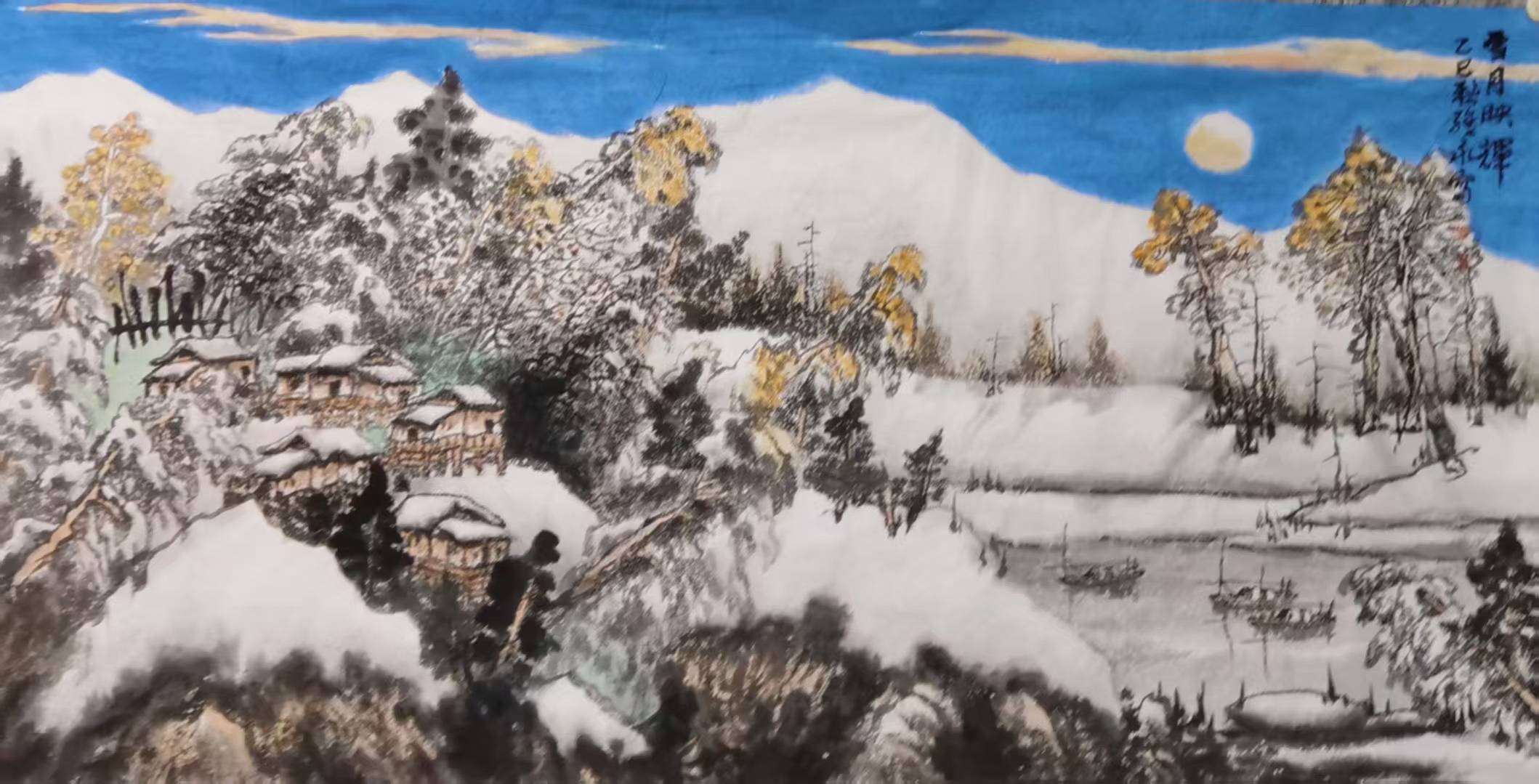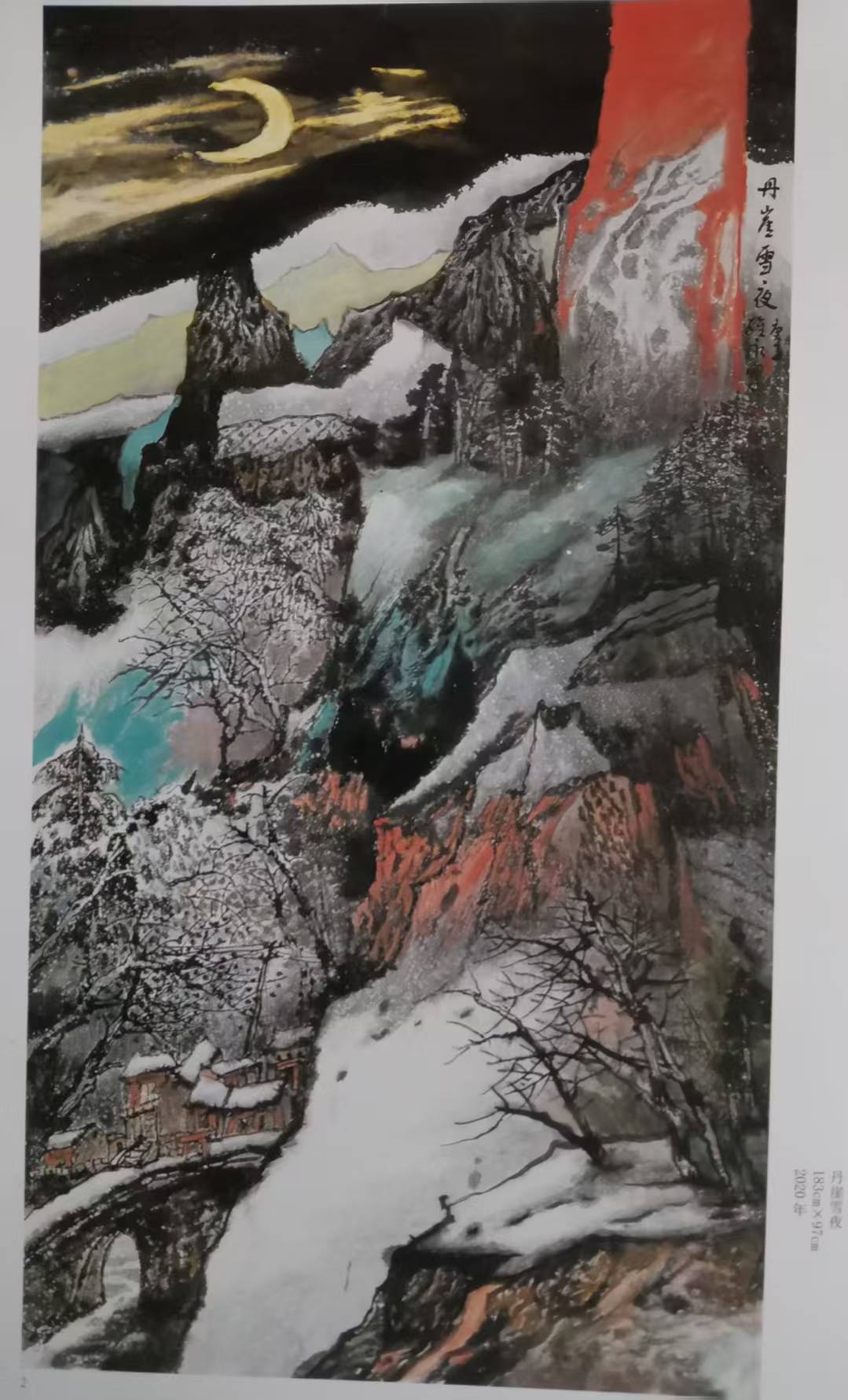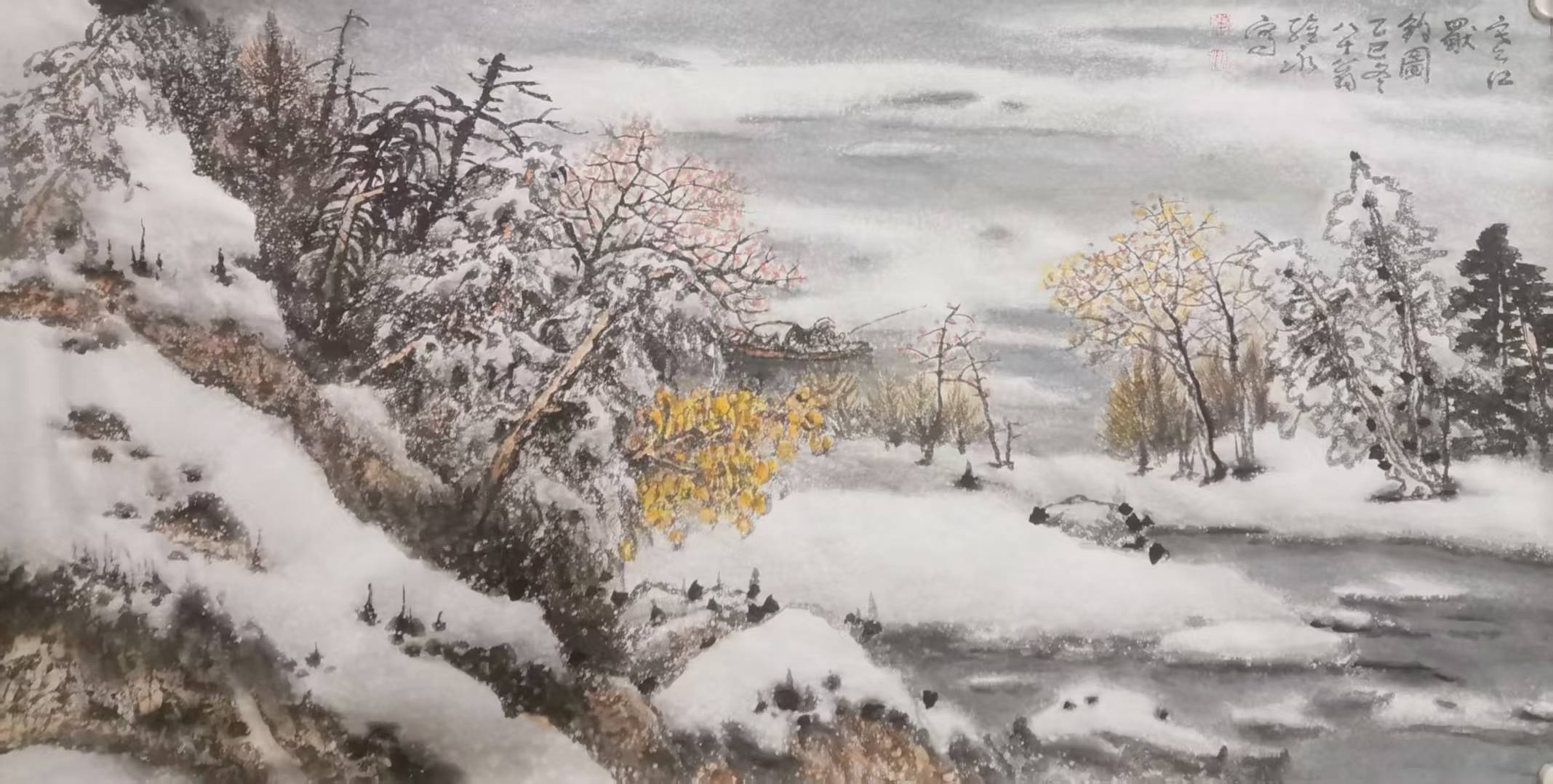 萧维永最突出的艺术突破,是用暖色调调和冷寂雪景,打破“雪景必为黑白清冷”的固化认知。传统雪景多以水墨为主,而他在长期写生中发现,雪后天地并非单色:枝头含青黛,崖石露赭红,晨昏与月色之下更有丰富的冷暖变化。他适度运用朱砂、赭石、石青等色,设色温和、艳而不俗,形成辨识度鲜明的色彩语言,为当代雪景山水的色彩表达拓展了空间。