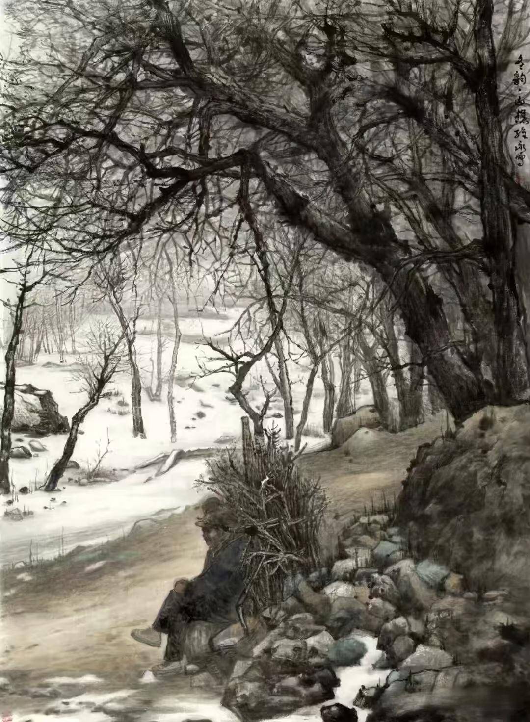 这一特点在《丹崖雪夜》与《冬韵山樵》中各具千秋。《丹崖雪夜》以西北丹霞写生为蓝本,夜色沉厚,白雪覆岭,丹崖以赭石、朱砂晕染,在冷色基调中尤为醒目,冷暖相生,尽显北方山川的雄阔气势与雪夜空灵的静谧意境。反观《冬韵山樵》,则以沂蒙寻常乡景入画,远处河套白雪茫茫,意境清旷;近处坡石残雪未消,寒意依稀,负柴山樵静坐石上、神情沉静。画家以焦墨、浓墨塑造山石林木,以淡墨、留白表现积雪,笔墨浓淡相生、虚实得体;雪隙间淡淡暖色隐现,于寒冬之中暗含生机。全画质朴平淡、不事雕琢,真切体现出中国画以景写心、以情传意的写意追求。