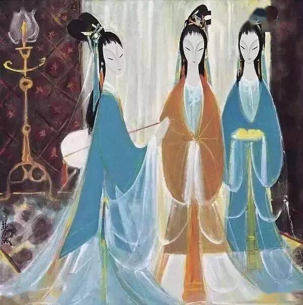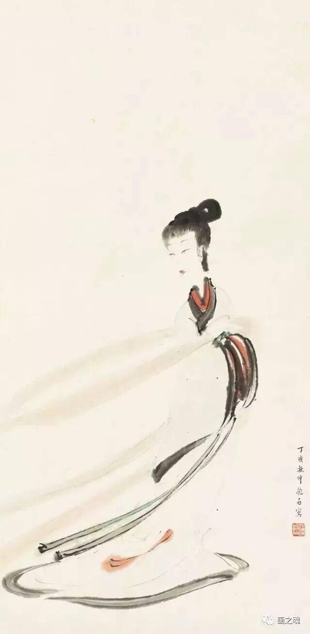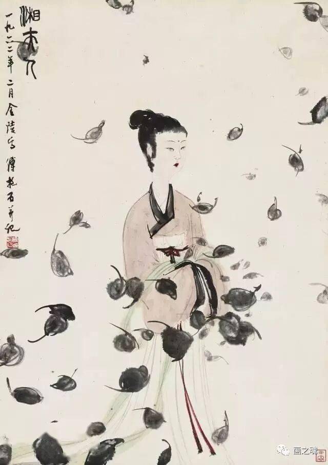 傅抱石的仕女画自成一派,风格统一,结合了山水画的浓墨重彩,将山水画技法充分利用到了仕女画中,创新了传统仕女画,堪称民国时期仕女画的“独特风光”。其中最具有代表性的有《游春仕女图》、《湘夫人》、《丽人图》、《琵琶行》等。