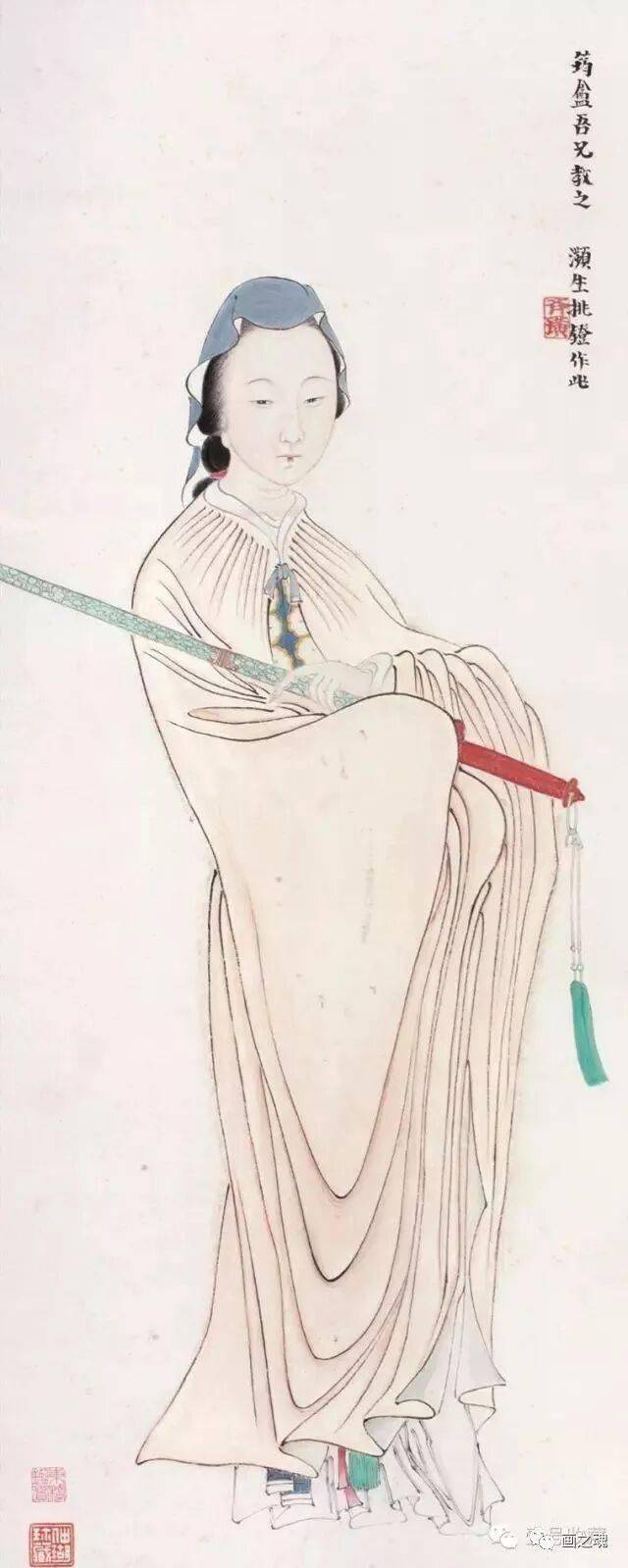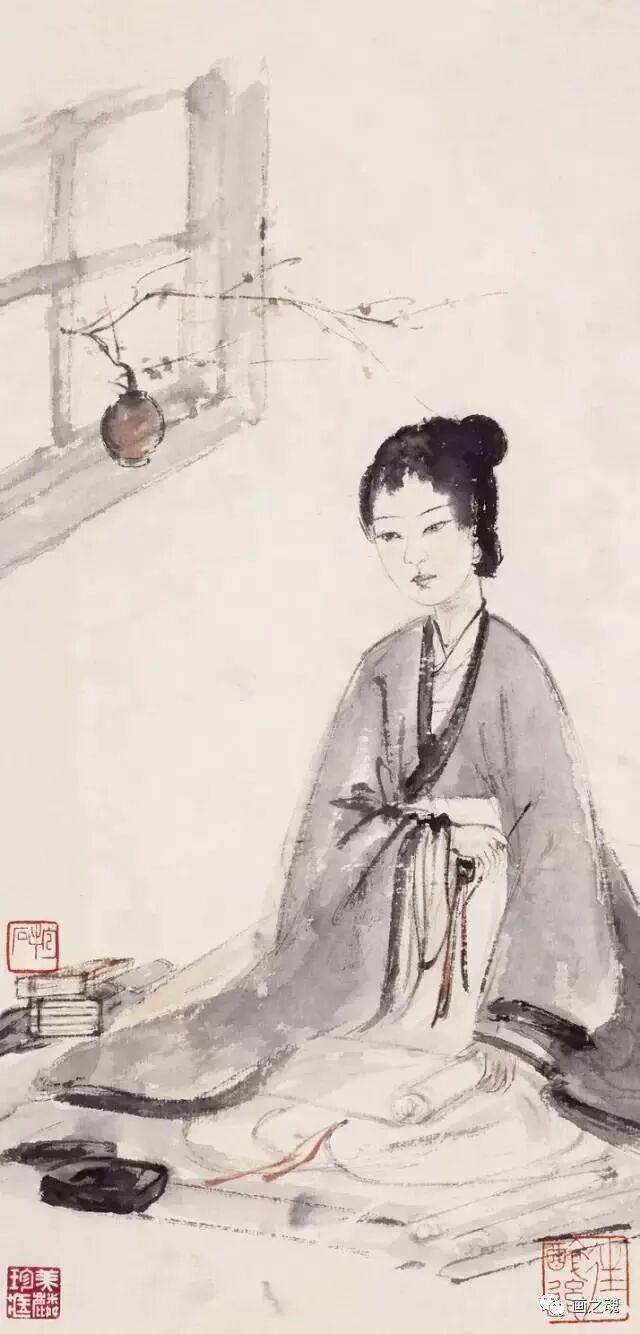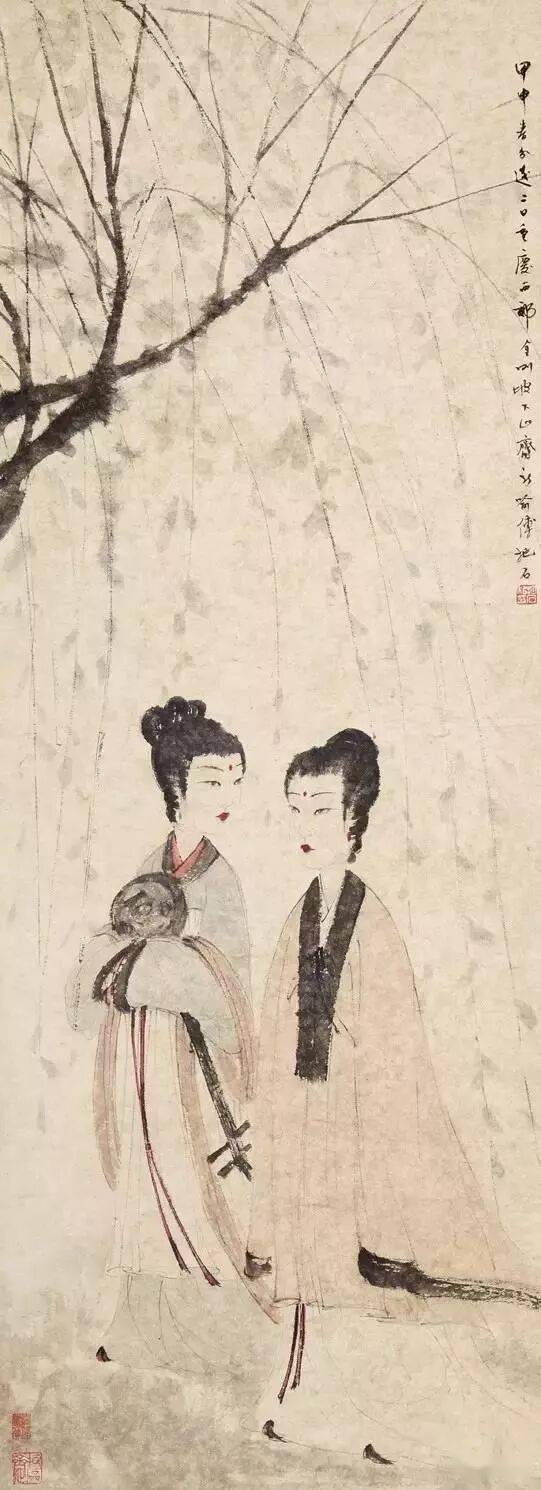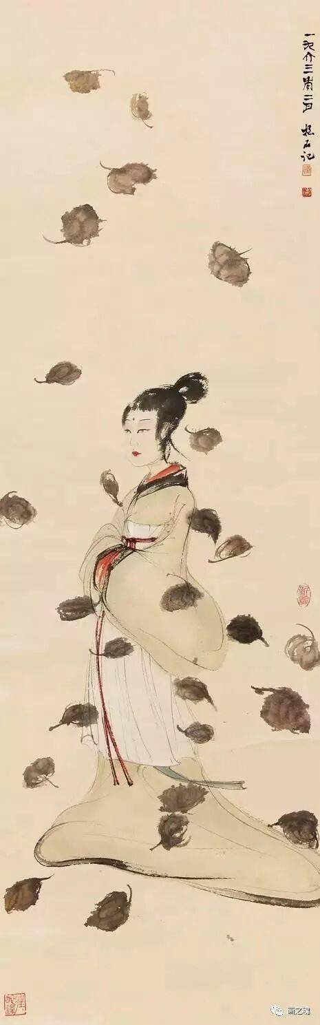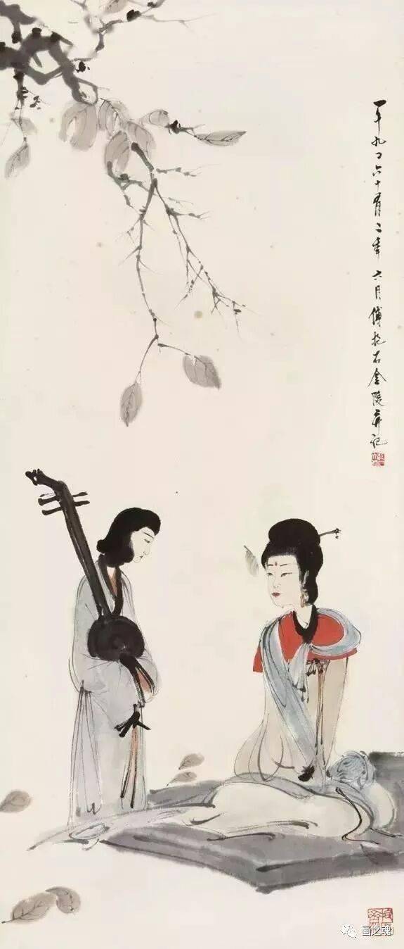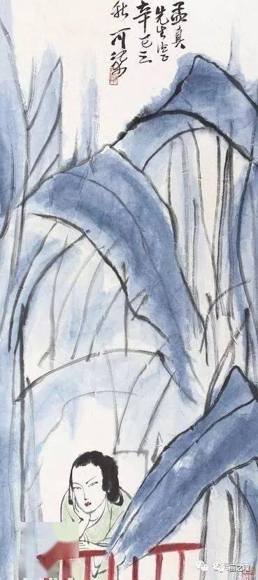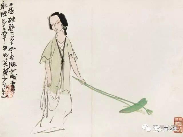 这种可与潘天寿“造险”功夫媲美的处理办法,显然是早年绘制抗战宣传画的直接影响。而仕女神情的刻画,则全从眼部的线条流出。虽未明言,但从仕女的眼神中,人们自然可以读出迷离、惆怅、空虚等种种感情,令人备觉为直接面对“悔教夫婿觅封侯”的闺中少妇了,可知其传神程度非比一般。