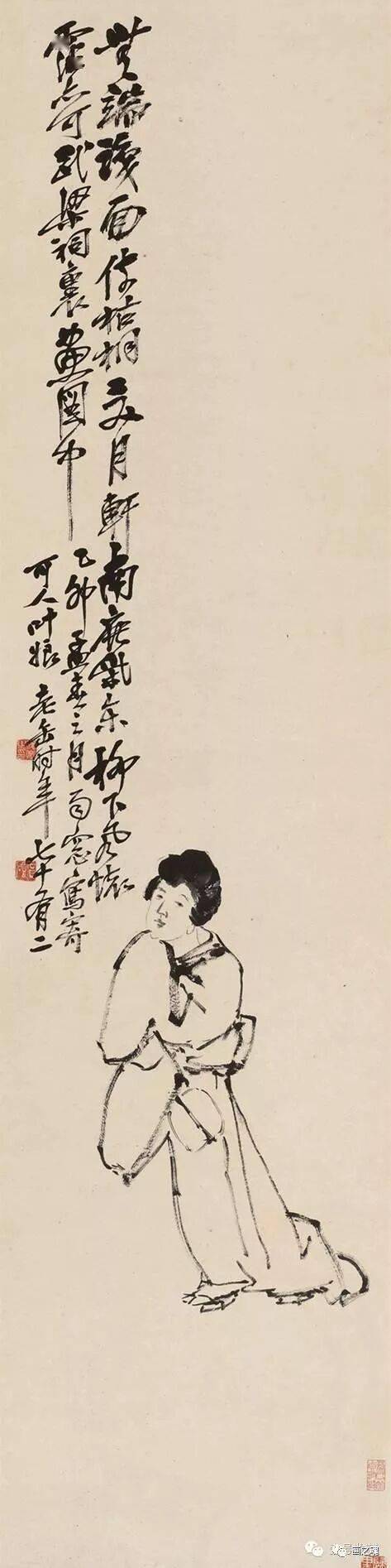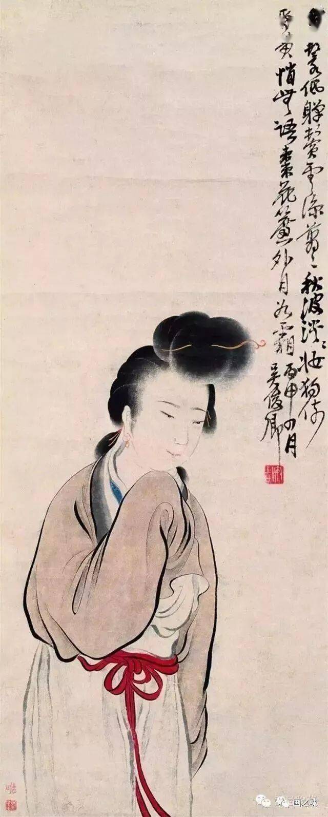 吴昌硕是中国近代画坛的巨匠,他的绘画以大写意花卉为主。人物作品不多,存世作品的也甚少,而仕女画更是难得一见。据有关统计,吴昌硕传世之作“花卉三千,山水不过数十,而人物仅存数件”。
