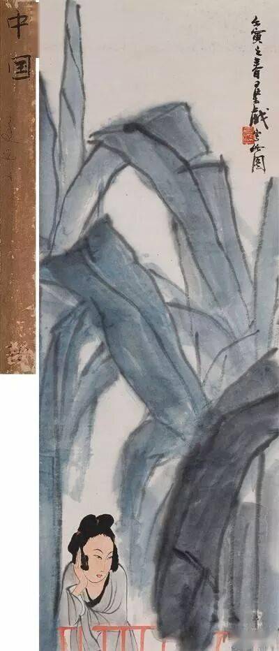 此幅1962年所作《芭蕉仕女》展示了李可染人物画的惊人天才。本画的意象只有芭蕉、仕女和朱栏三个,李可染刻意加强作为配角的芭蕉叶与作为主角的仕女在体量、形象、繁简上的悬殊对比,又在色彩和空间上刻意将芭蕉与朱栏对比,形成一种充满外在夸张和内在幽默的审美张力,近于漫画(但绝非漫画)而攫人眼球。