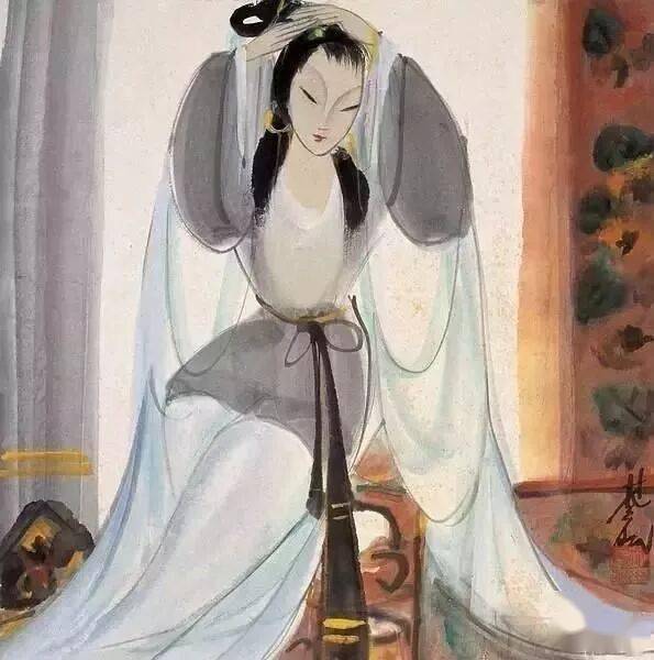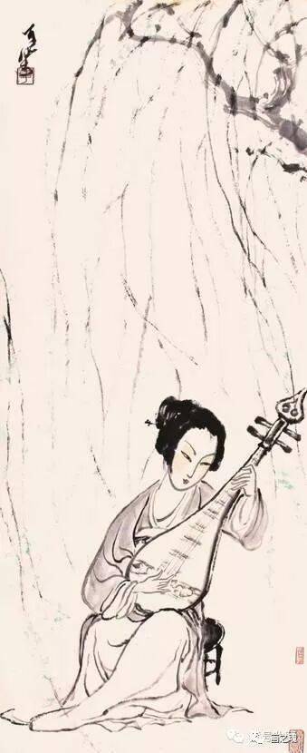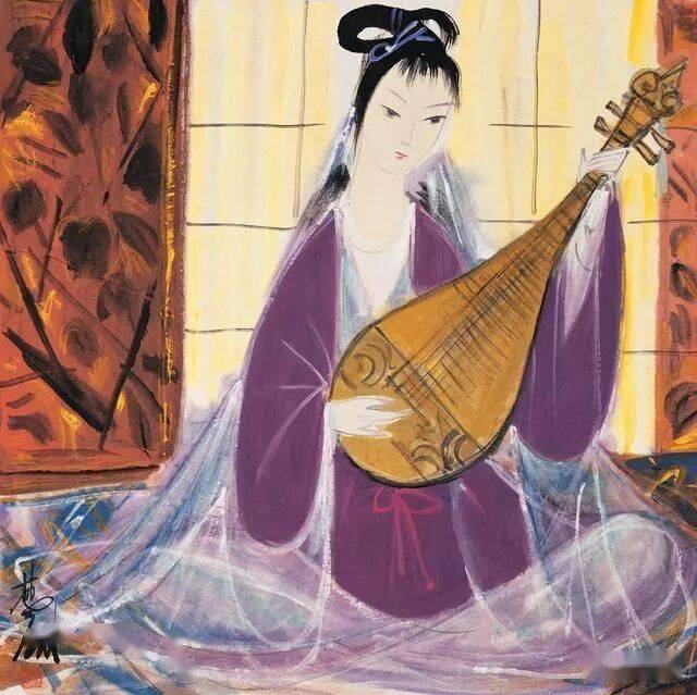 此画于六十年代末七十年代初,该幅作品在表现手法和绘画样式上单纯、简洁,用较少的笔墨,表达了更为丰富的精神内涵。画面上身着紫衣的仕女怀抱琵琶,身披白纱,飘柔流畅的线条与温宛和谐的色彩有机的融合在一起,颇具音乐性的韵律。在用色方面,增强画面的透明感,折射出一种平和而含蓄的美。
